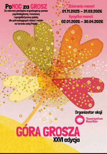 Zapraszamy do udziału w akcji GÓRA GROSZA 2026. Akcja organizowana jest przez Towarzystwo Nasz Dom. Zebrane pieniądze przeznaczone będą na specjalistyczną pomoc dla dzieci i rodzin z całej Polski.