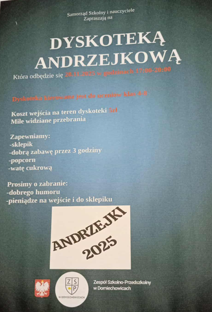 Samorząd Uczniowski serdecznie zaprasza na dyskotekę andrzejkową uczniów klas IV-VIII 28 listopada 2025r. w godz. 17.00-20.00:)