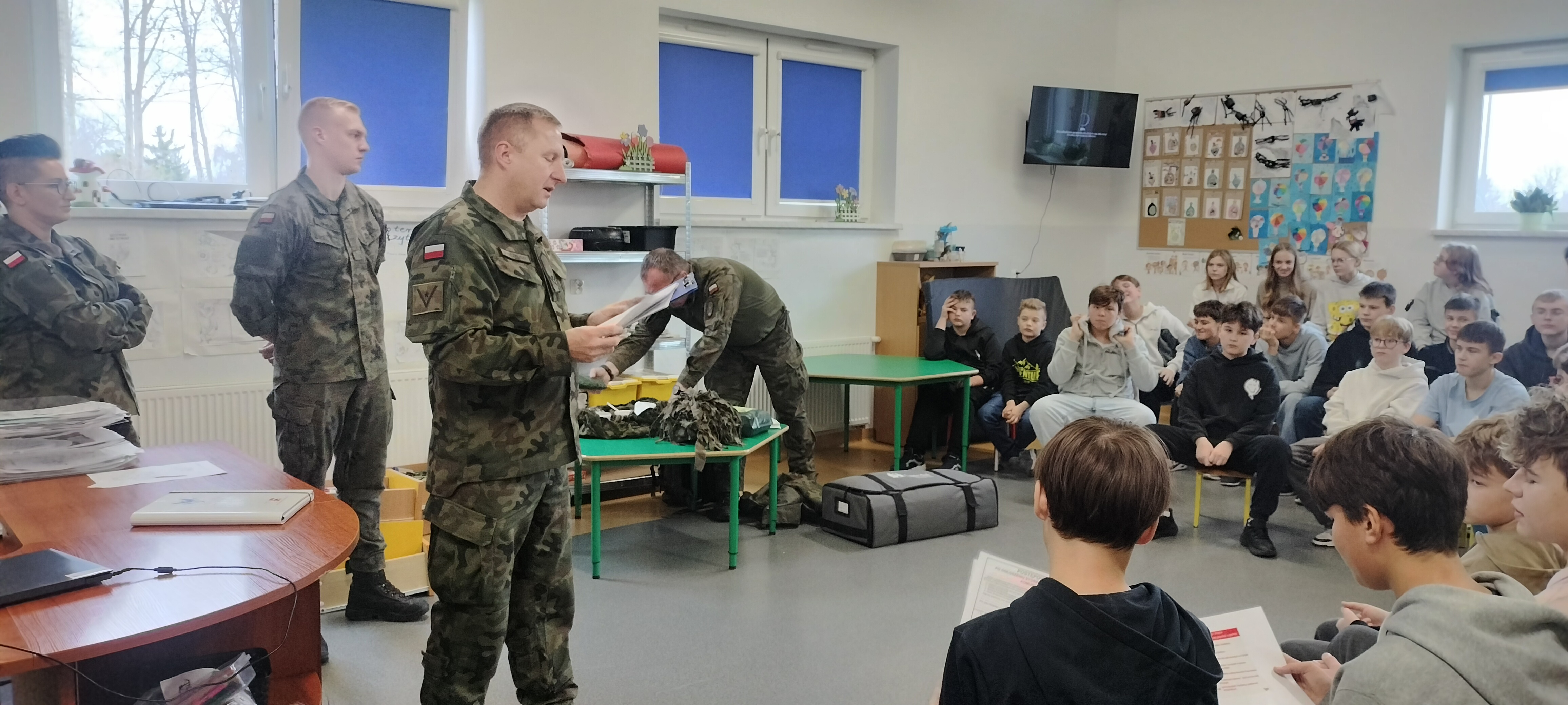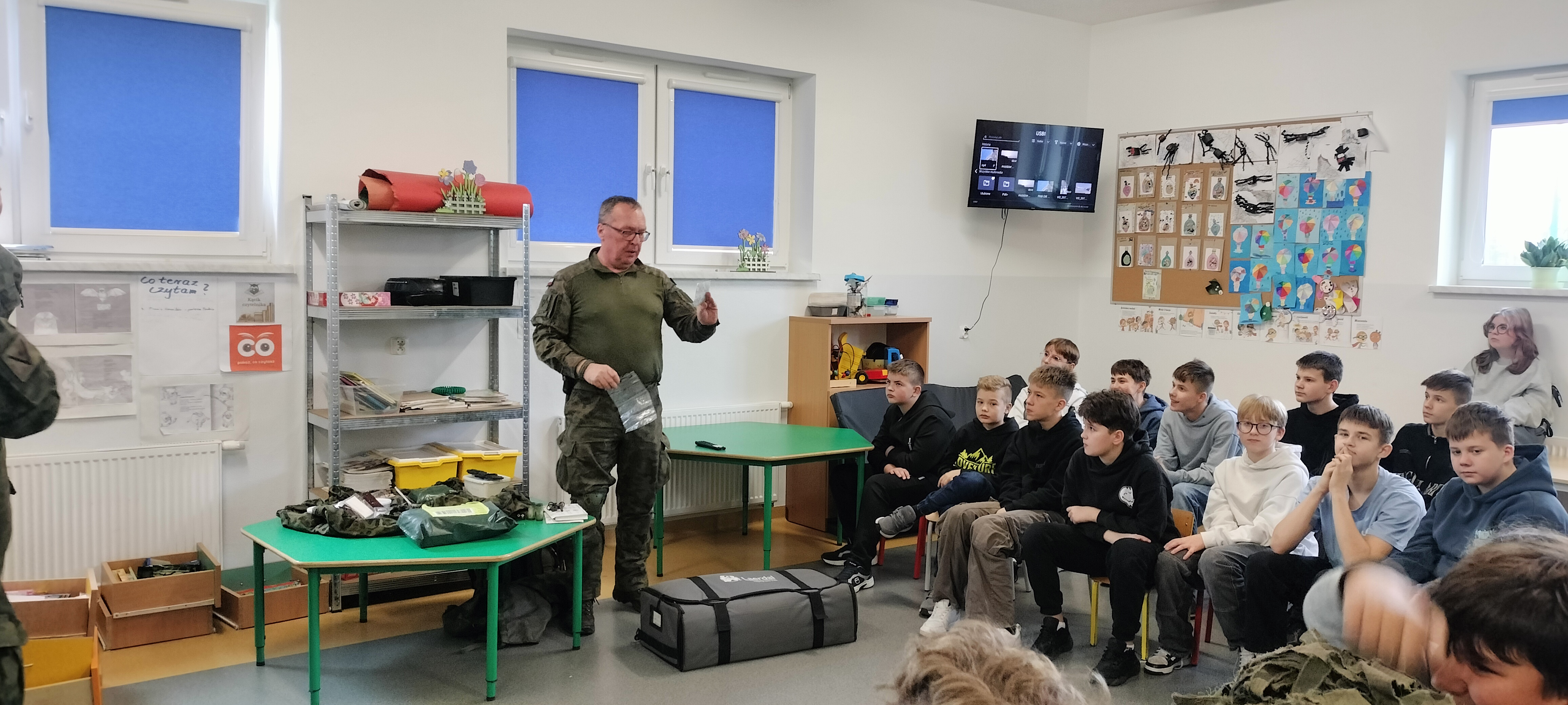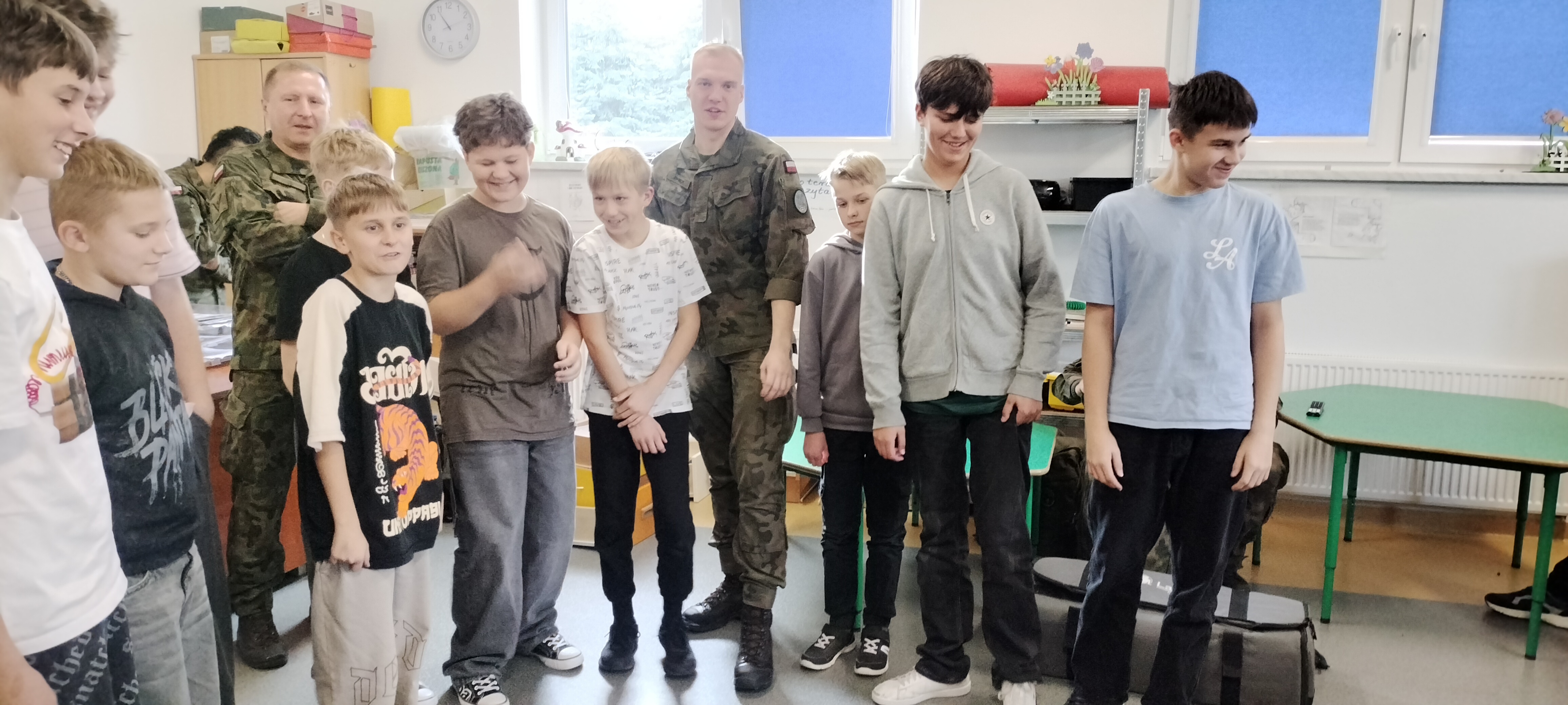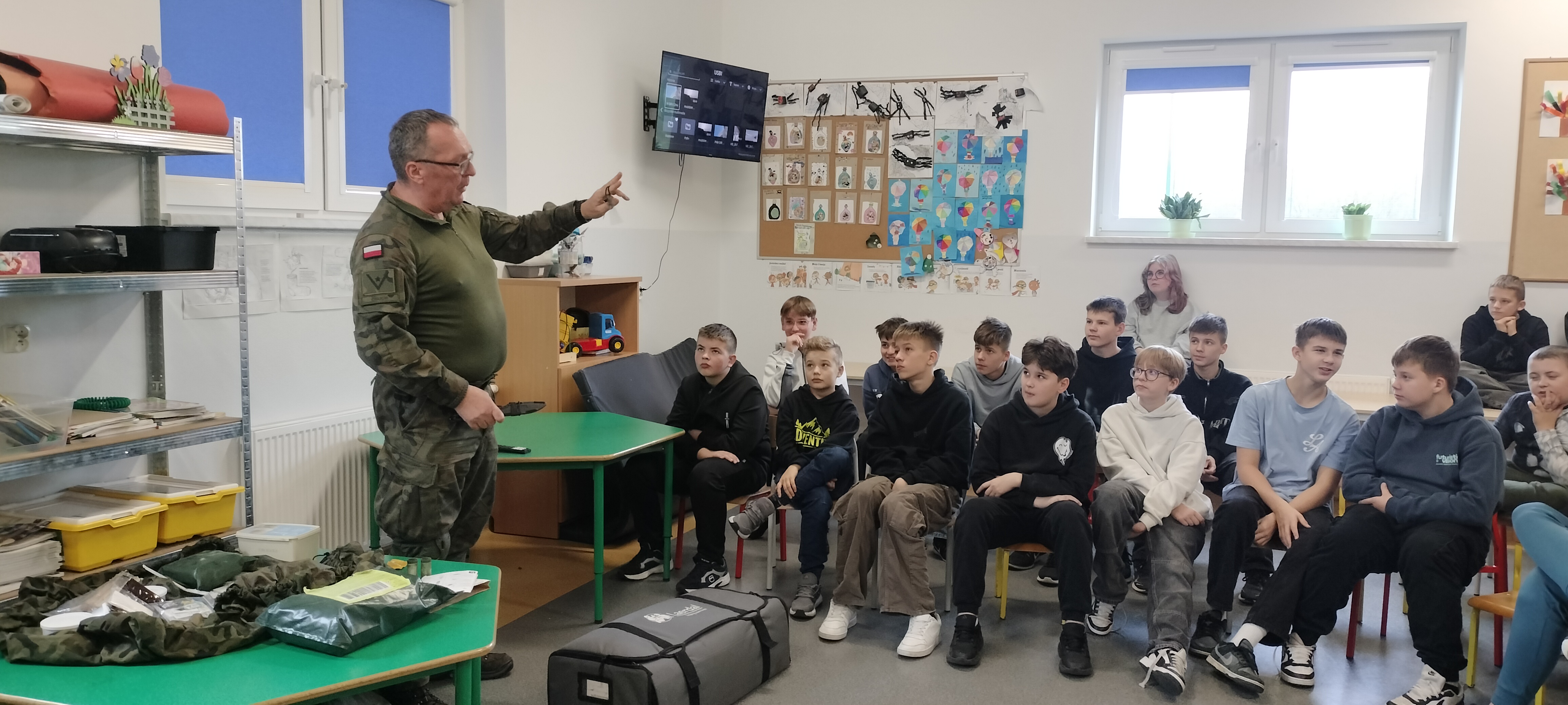 W dniu 17 listopada 2025 r. W ramach rządowej akcji "Edukacja z wojskiem" odbyło się spotkanie z klasami VI, VII i VIII. Warsztaty miały na celu podniesienie świadomości dzieci i młodzieży w obszarze bezpieczeństwa i obronności. Goście w ciekawy i przystępny sposób opowiedzieli o zasadach alarmowania, udzielania pierwszej pomocy, ewakuacji, schronieniu, zagrożeniu informacyjnym i cyberzagrożeniach.