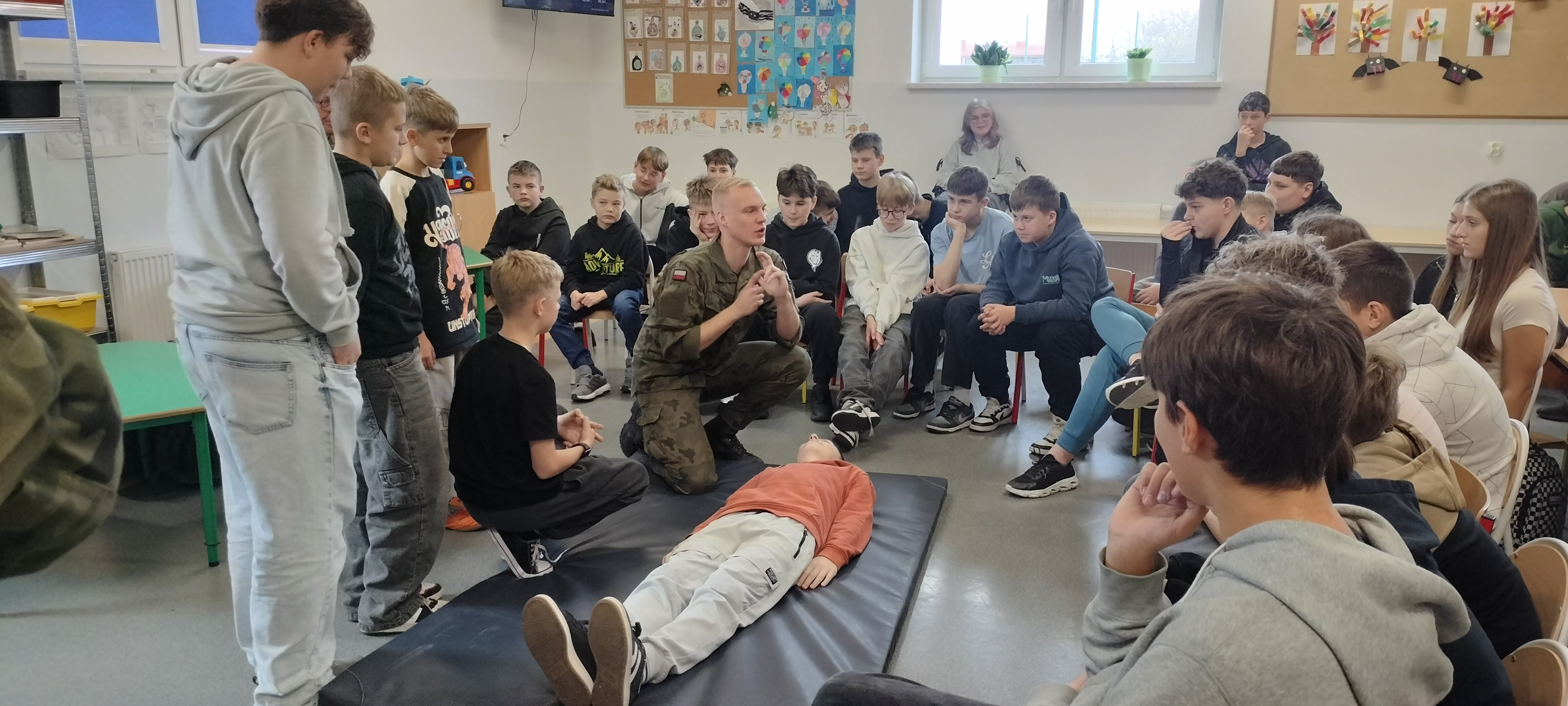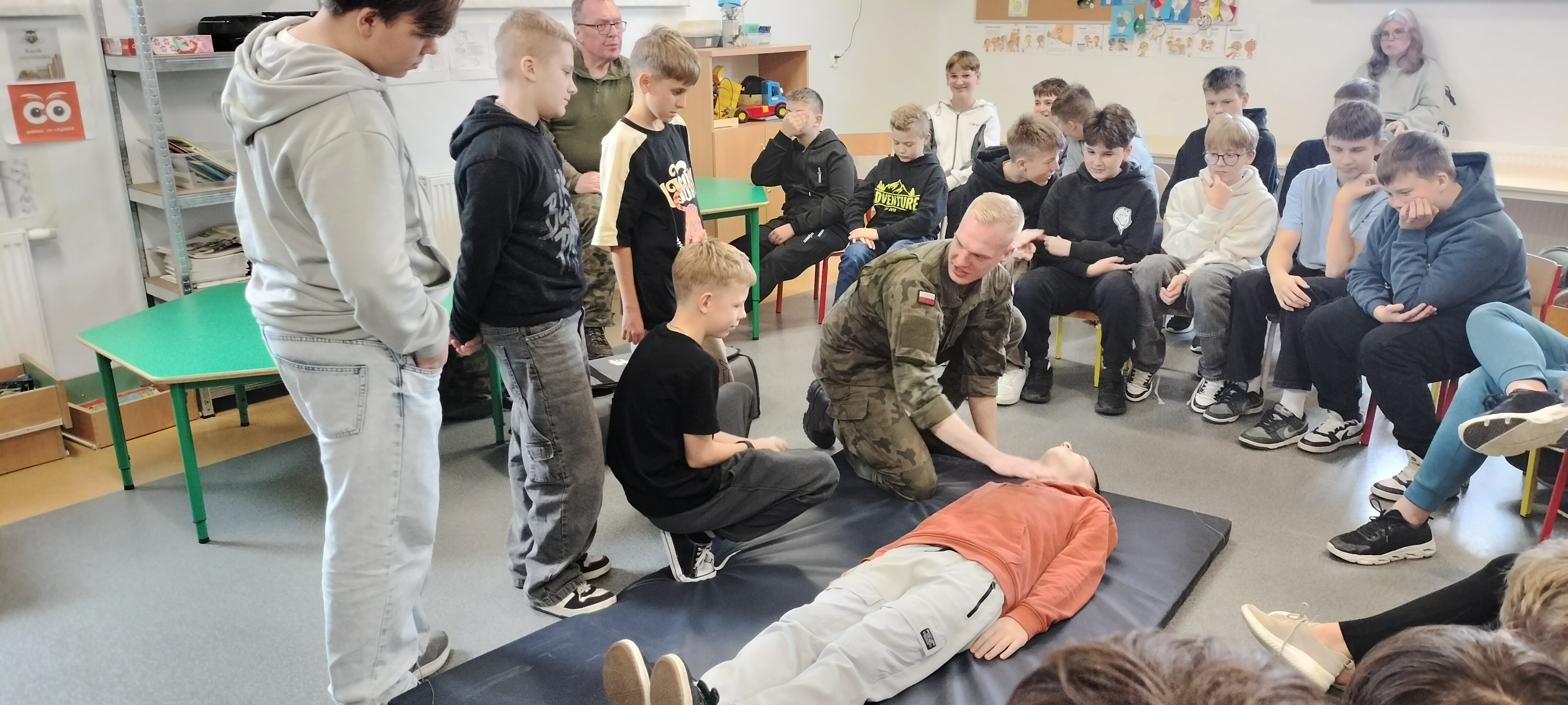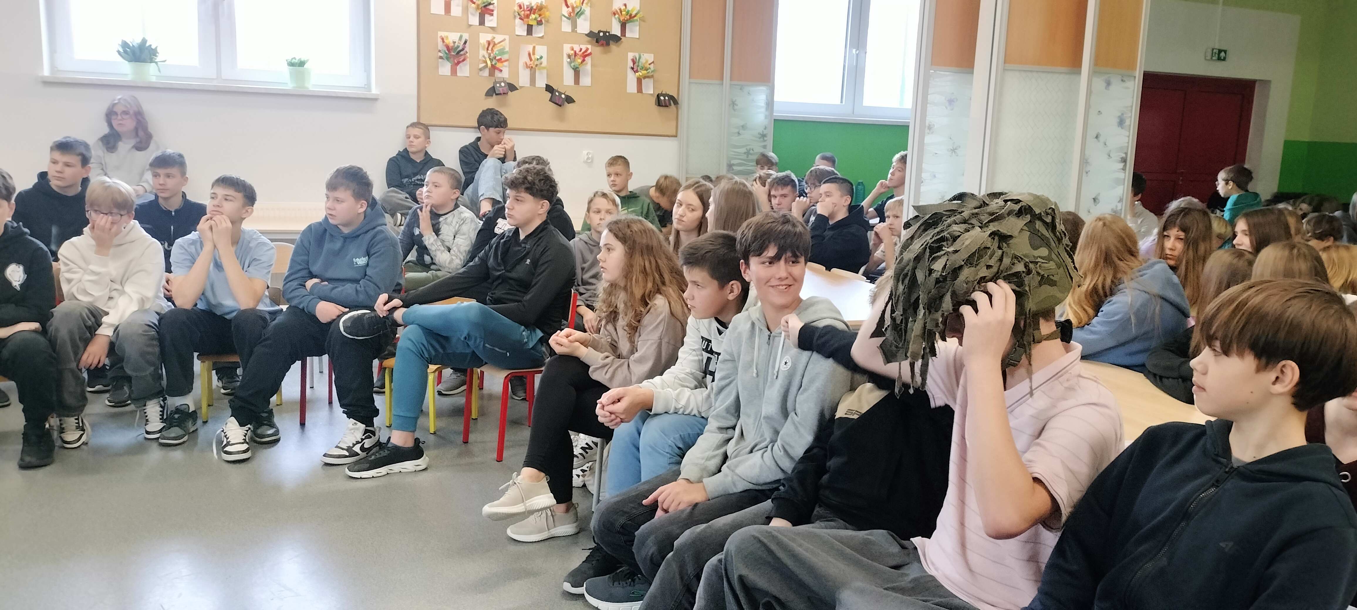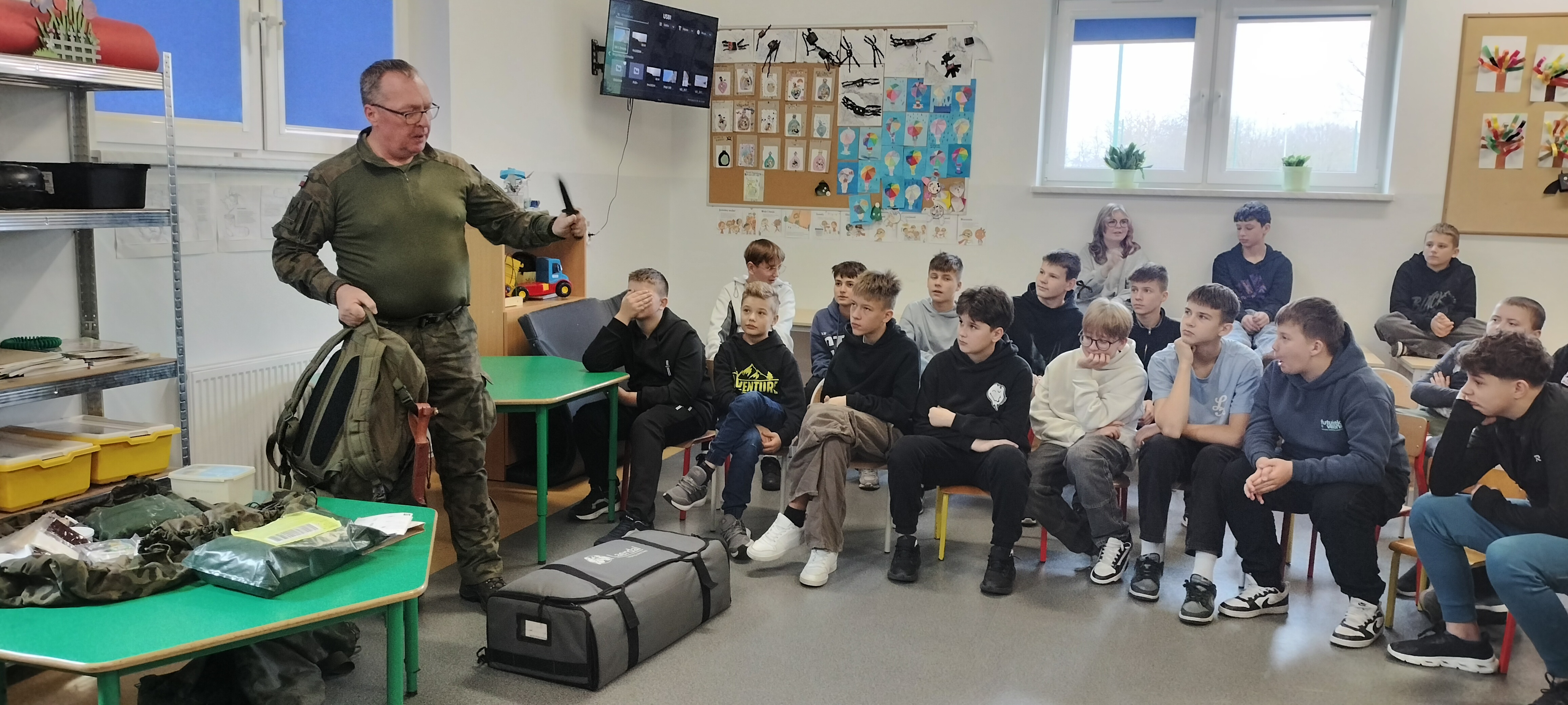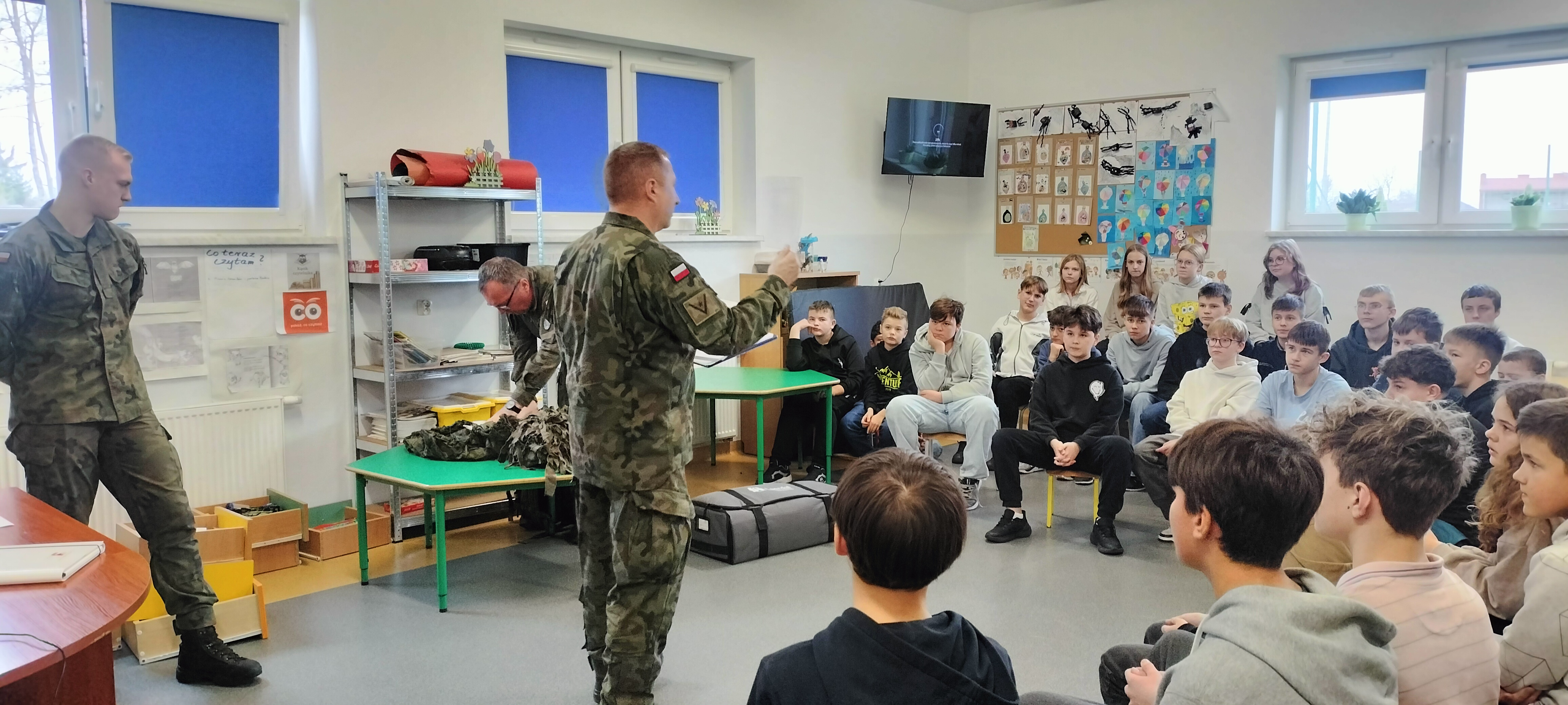 W dniu 17 listopada 2025 r. W ramach rządowej akcji "Edukacja z wojskiem" odbyło się spotkanie z klasami VI, VII i VIII. Warsztaty miały na celu podniesienie świadomości dzieci i młodzieży w obszarze bezpieczeństwa i obronności. Goście w ciekawy i przystępny sposób opowiedzieli o zasadach alarmowania, udzielania pierwszej pomocy, ewakuacji, schronieniu, zagrożeniu informacyjnym i cyberzagrożeniach.