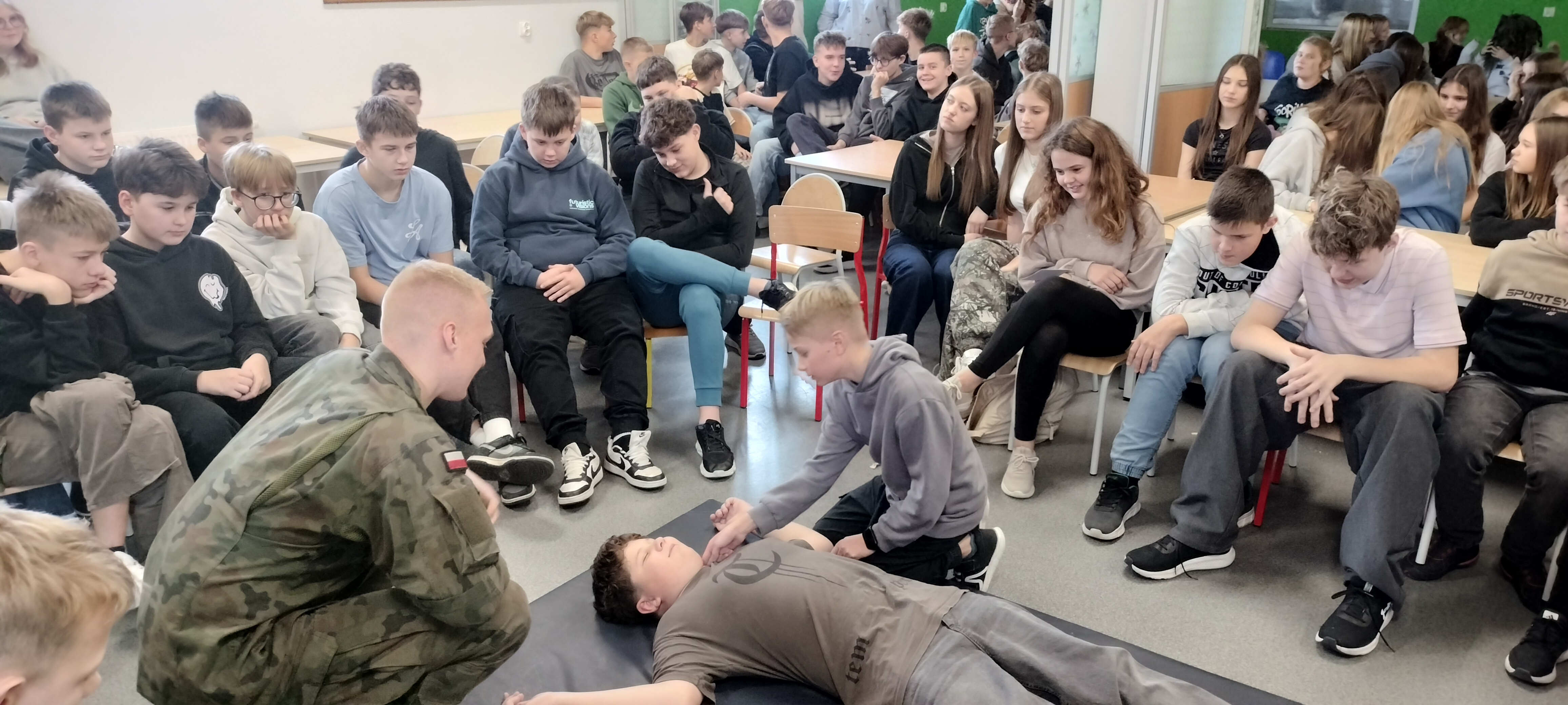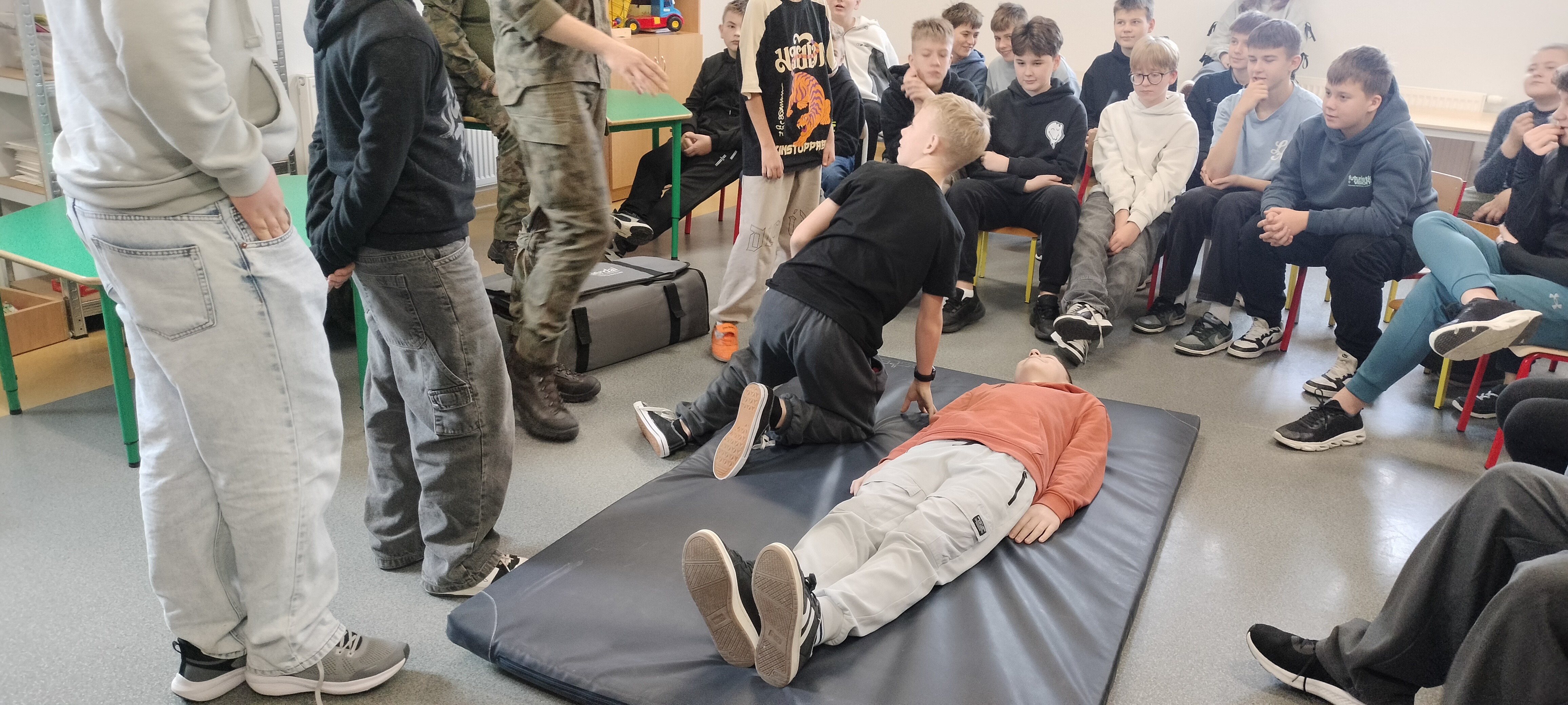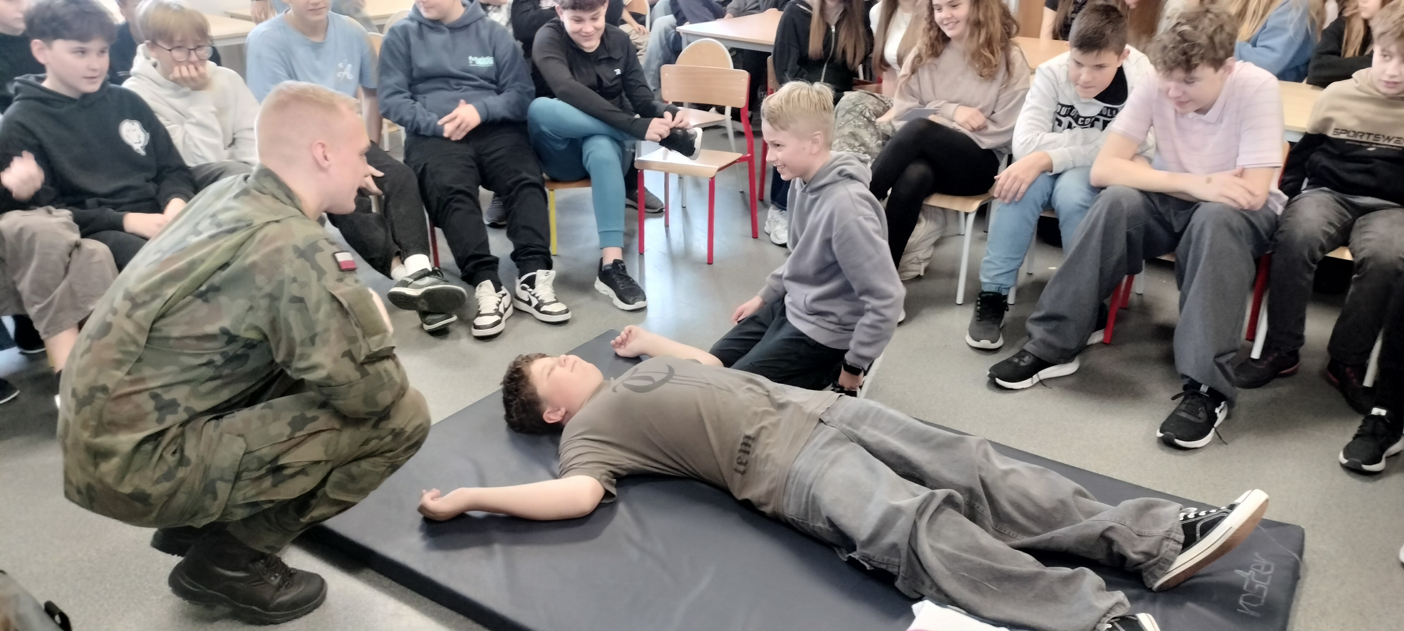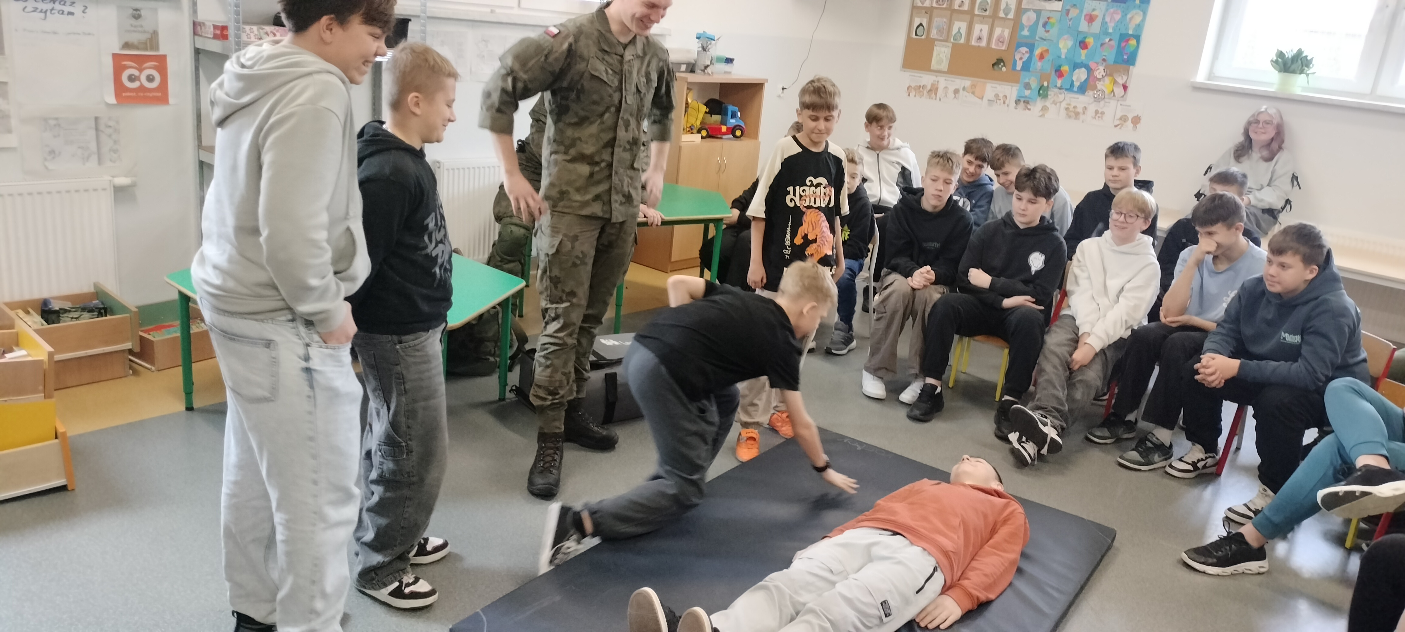 W dniu 17 listopada 2025 r. W ramach rządowej akcji "Edukacja z wojskiem" odbyło się spotkanie z klasami VI, VII i VIII. Warsztaty miały na celu podniesienie świadomości dzieci i młodzieży w obszarze bezpieczeństwa i obronności. Goście w ciekawy i przystępny sposób opowiedzieli o zasadach alarmowania, udzielania pierwszej pomocy, ewakuacji, schronieniu, zagrożeniu informacyjnym i cyberzagrożeniach.