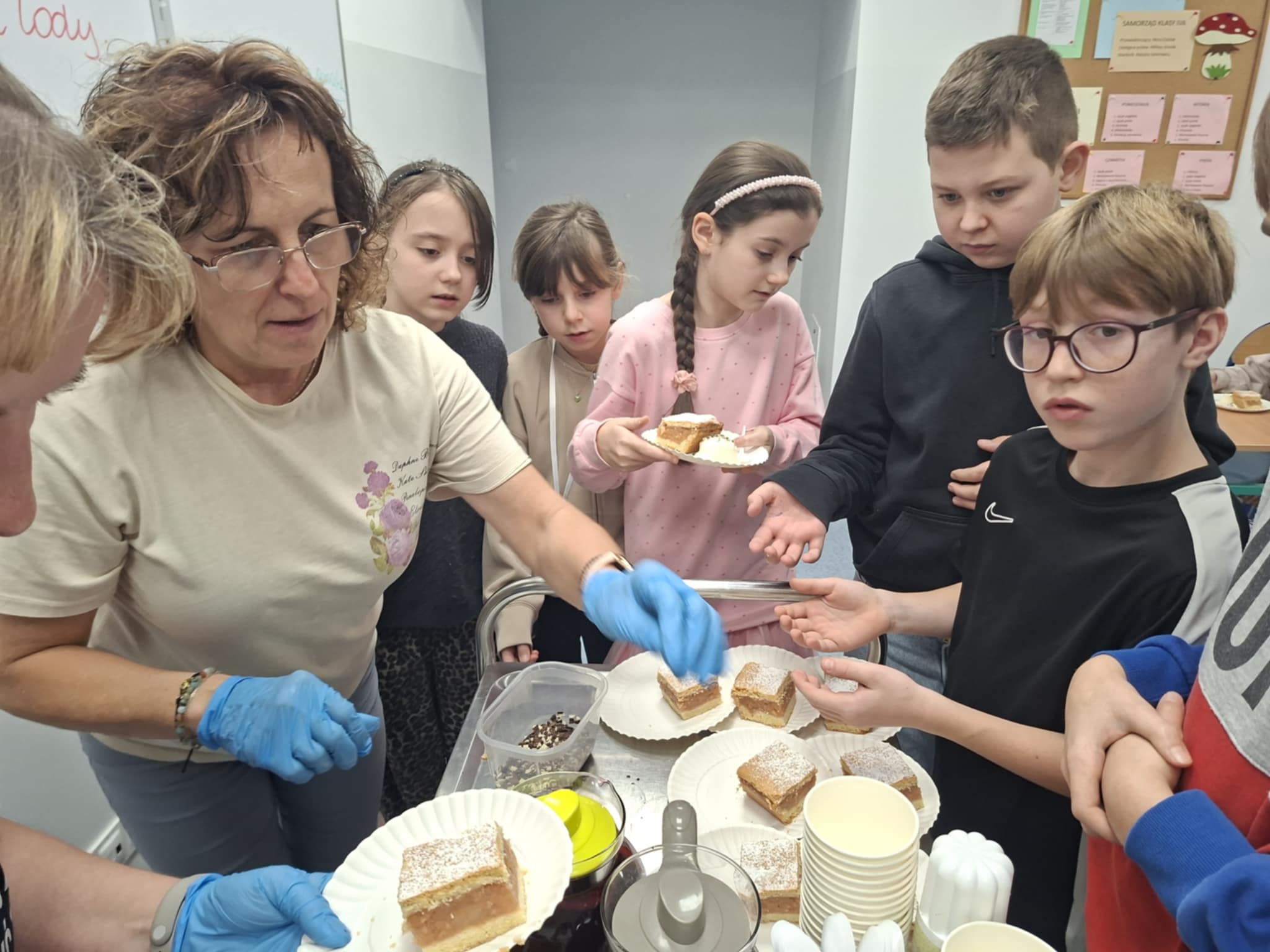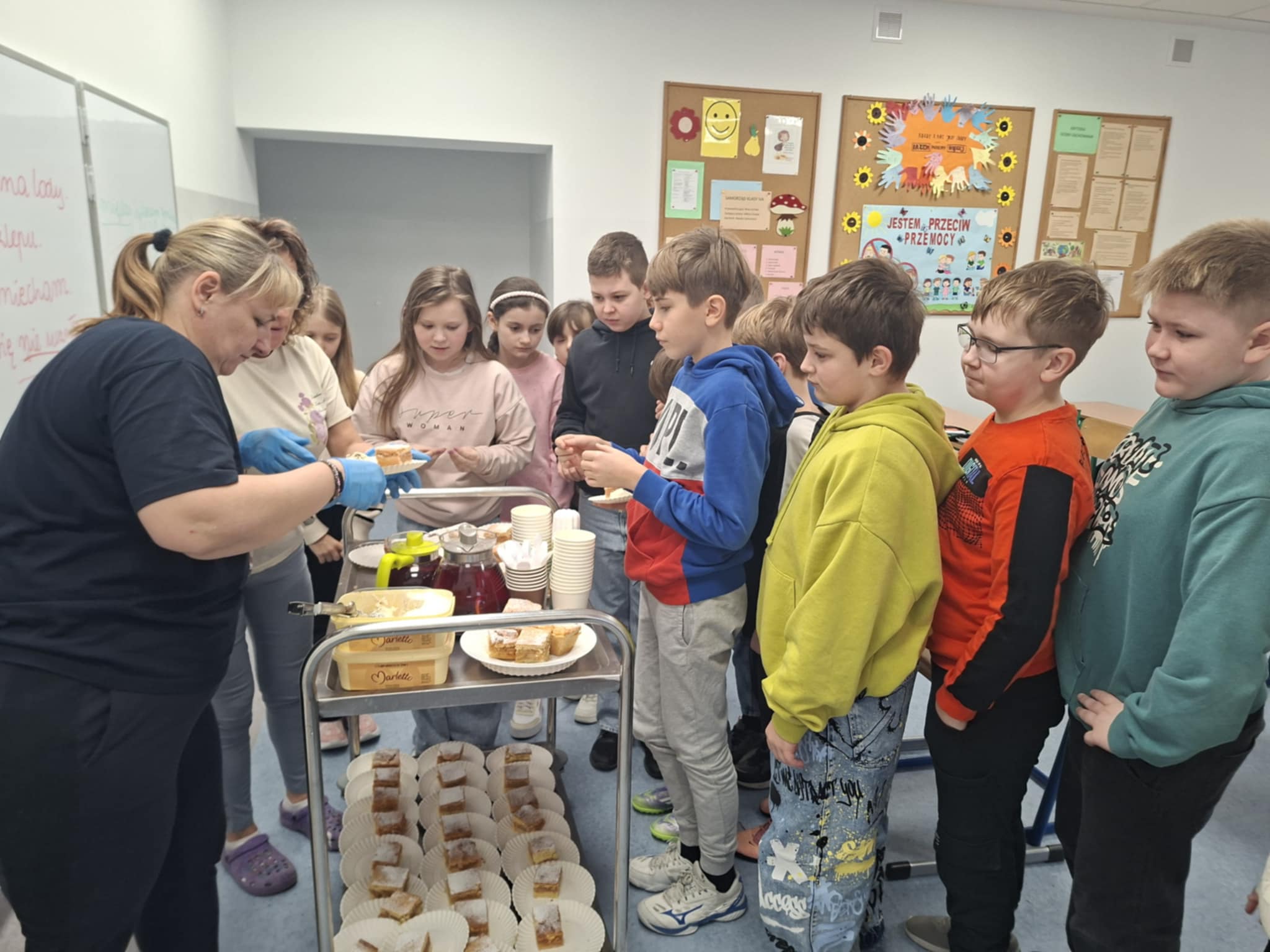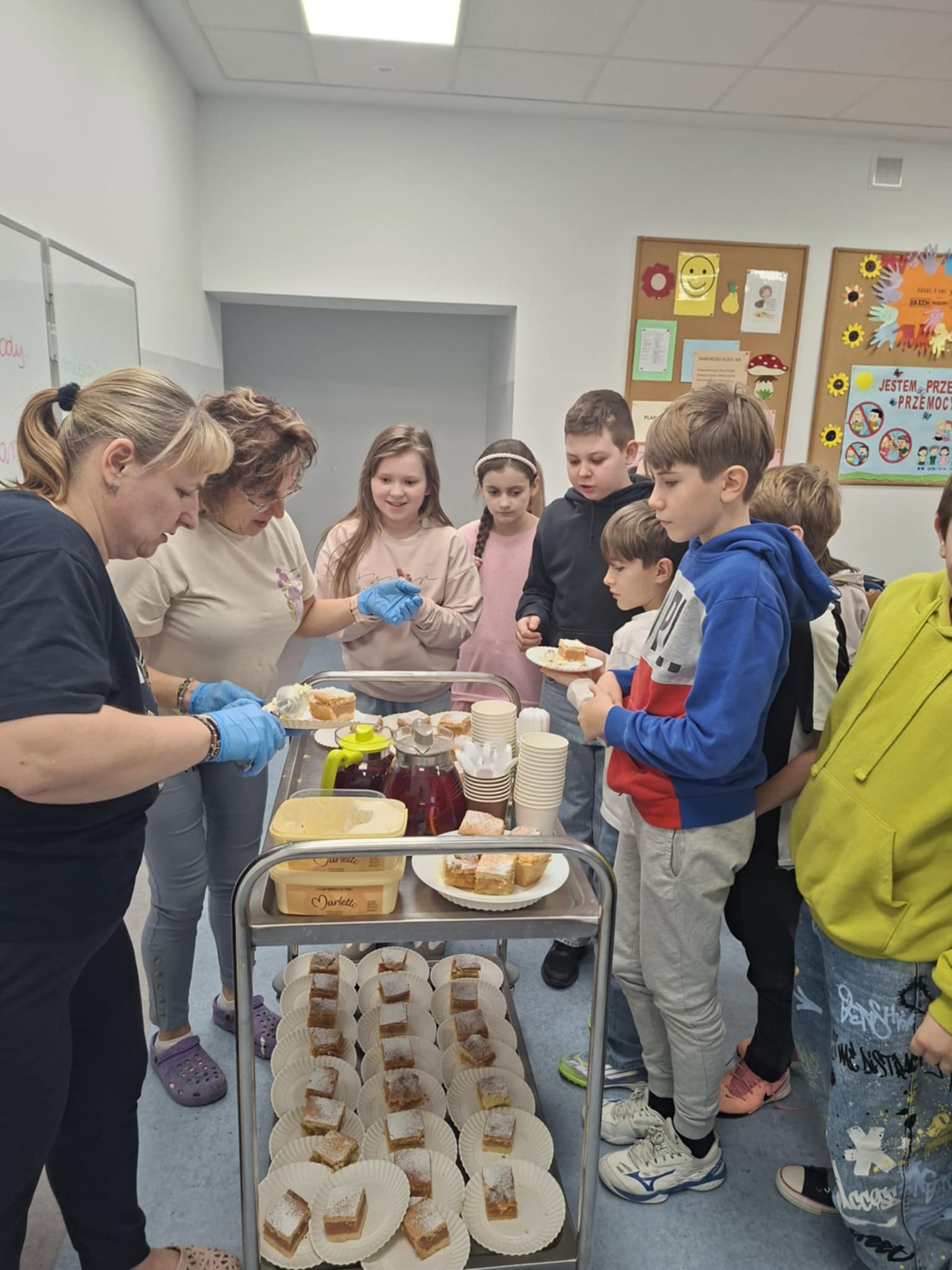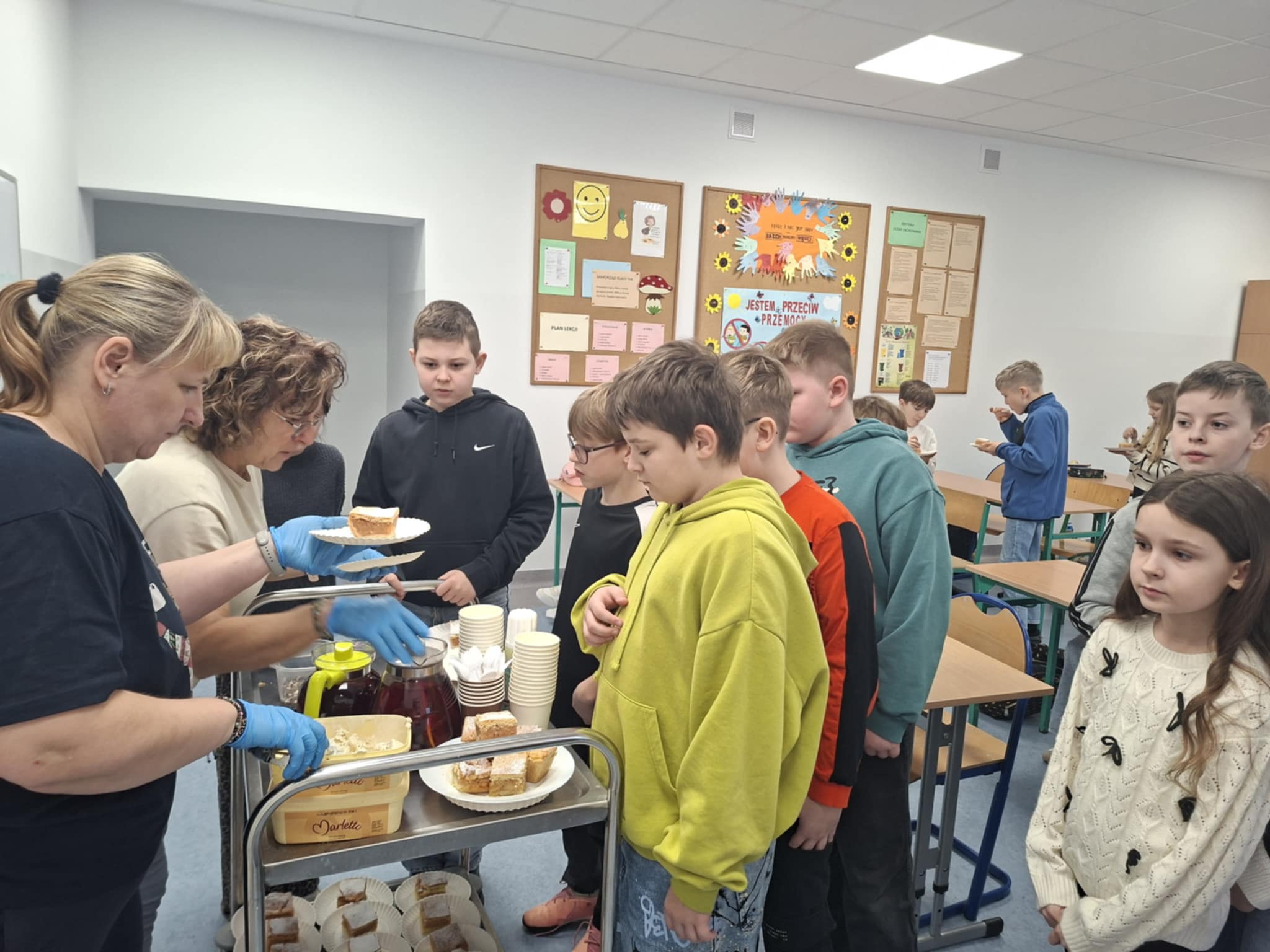 Klasy I-III otrzymały upominki a klasy IV-VIII VOUCHER na dzień bez pytania, który uroczyście wręczyła Pani Dyrektor Aleksandra Fornalik. Słodkie upominki, czyli pyszna domowa szarlotka z lodami oraz zimowa herbatka sprawiły wszystkim ogromną radość.