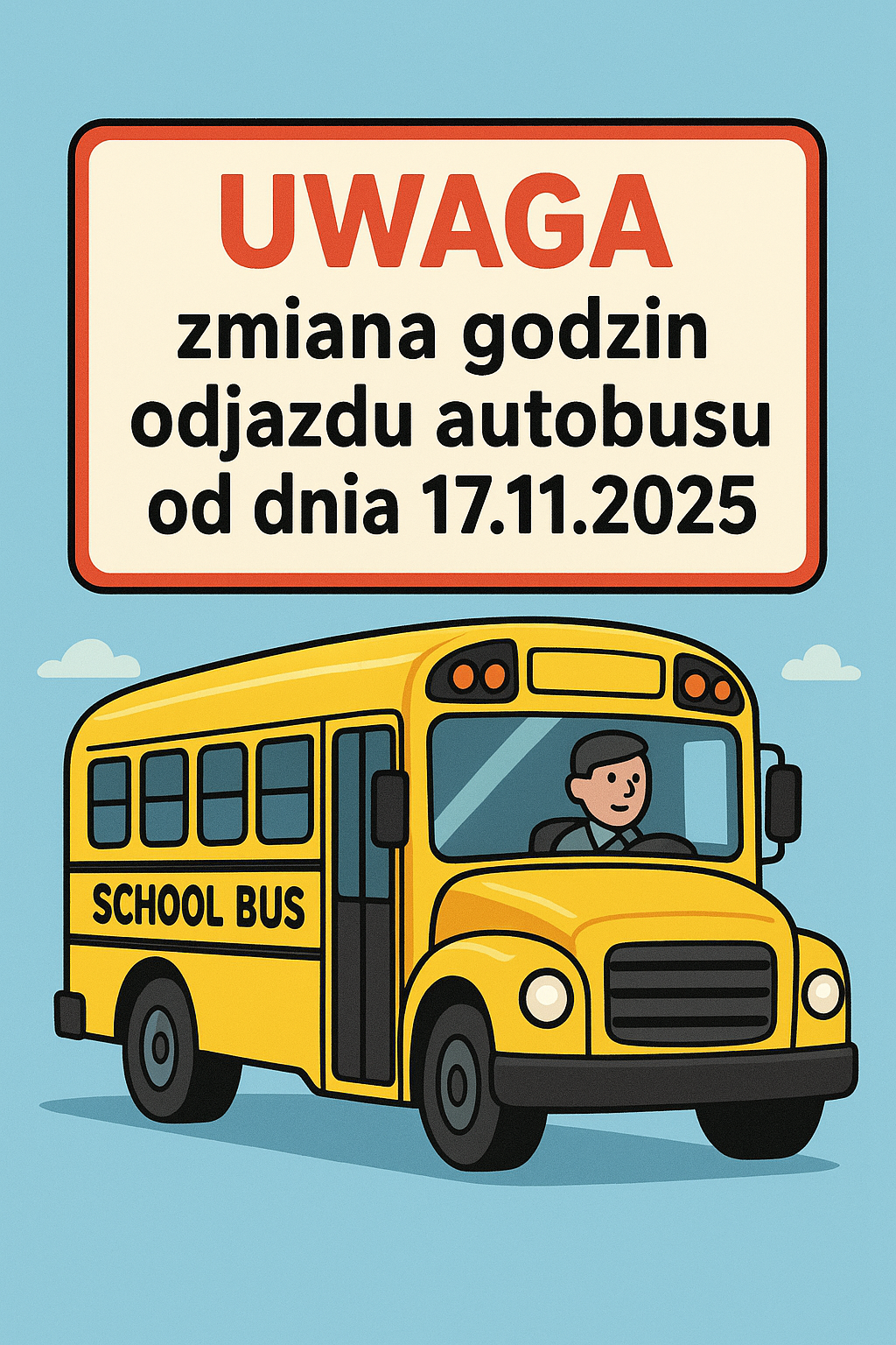 W związku ze zmianą planu lekcji, od najbliższego poniedziałku tj. 17.11.2025r. będzie obowiązywał nowy harmonogram odwozu do domu (załącznik poniżej). Godziny dowozu do szkoły pozostają bez zmian.
