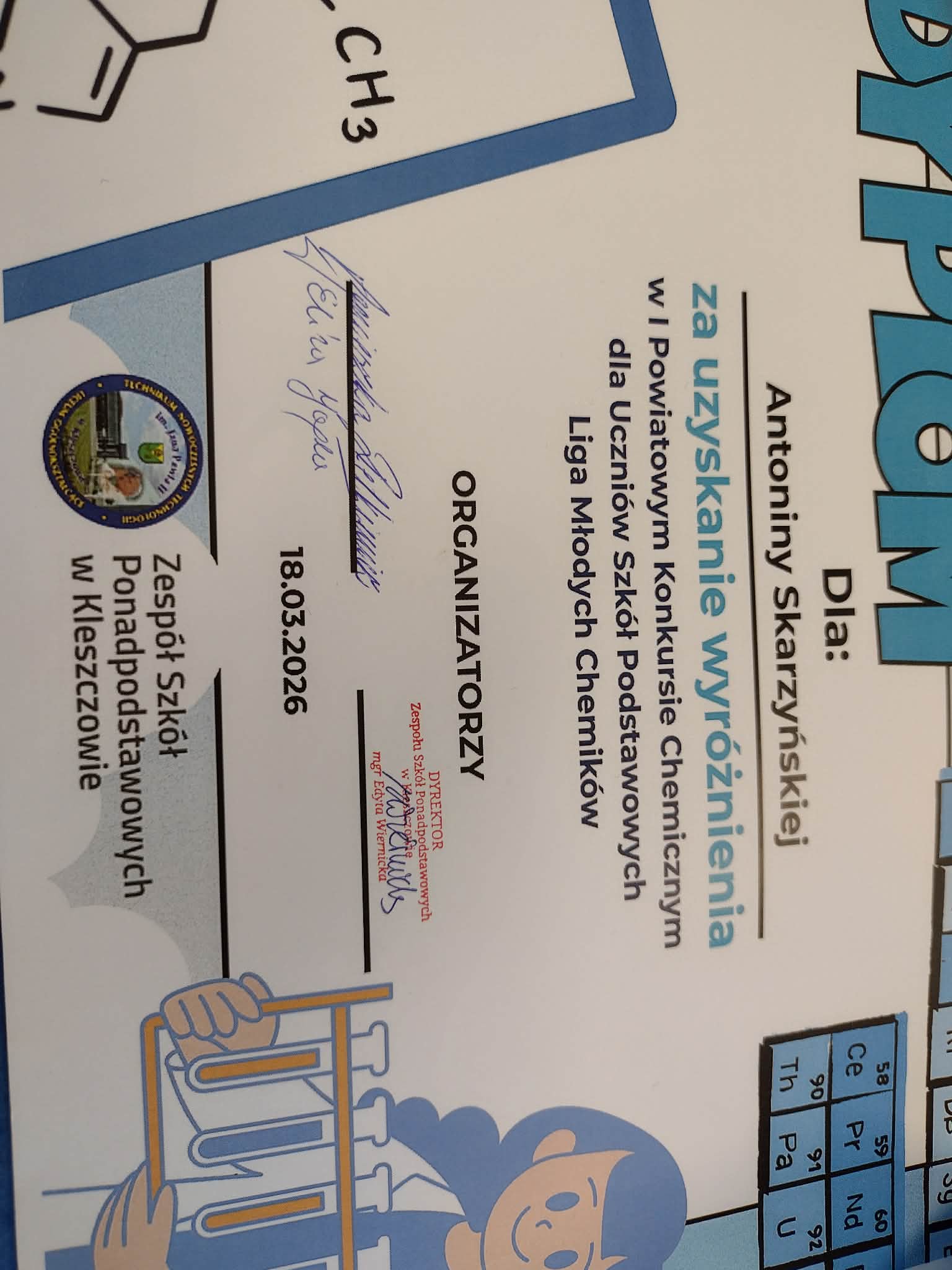 Antonina Skarzyńska, uczennica klasy VIIB, uzyskała wyróżnienie w I Powiatowym Konkursie Chemicznym dla Uczniów Szkół Podstawowych "Liga Młodych Chemików" organizowanym przez Zespół Szkół Ponadpodstawowych w Kleszczowie. Gratulujemy! Jesteśmy dumni! Życzymy dalszych sukcesów.