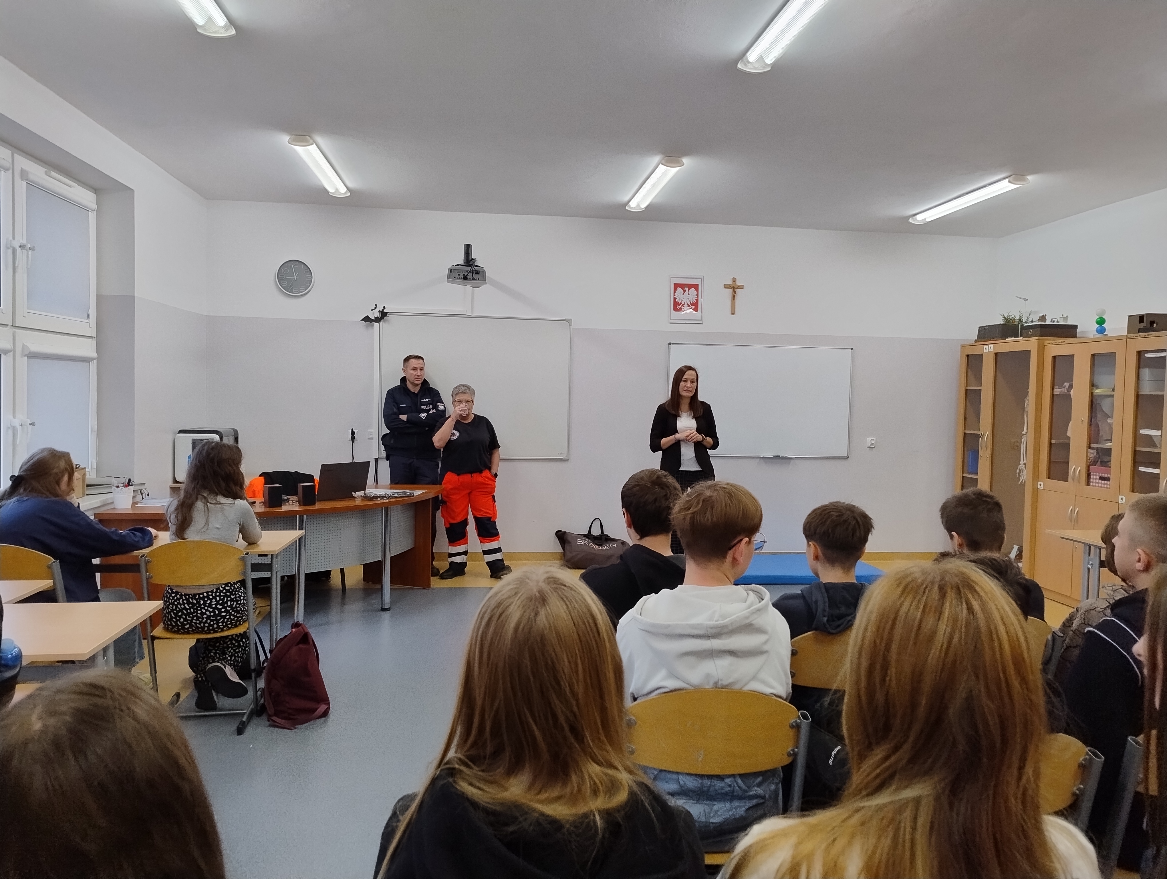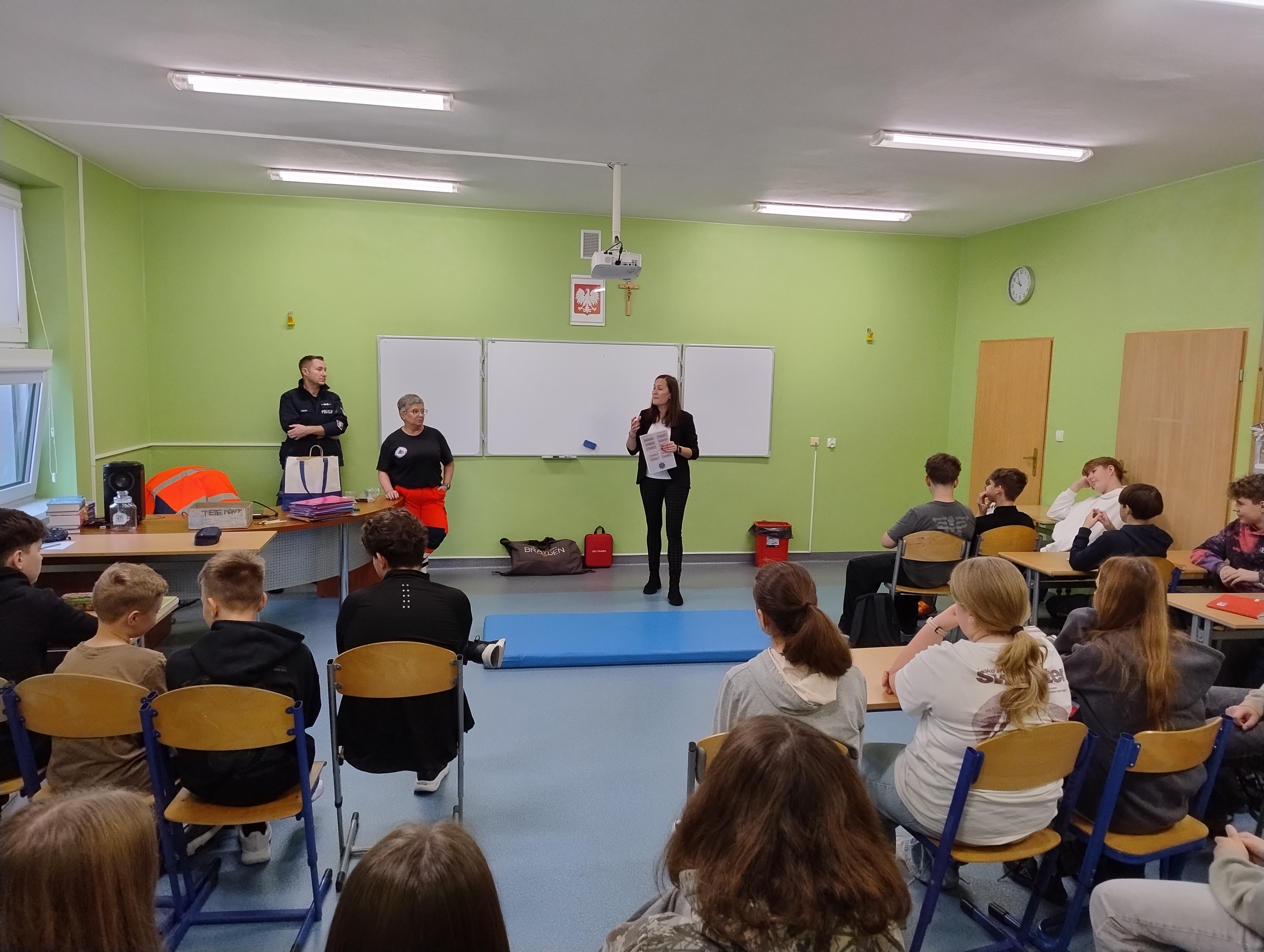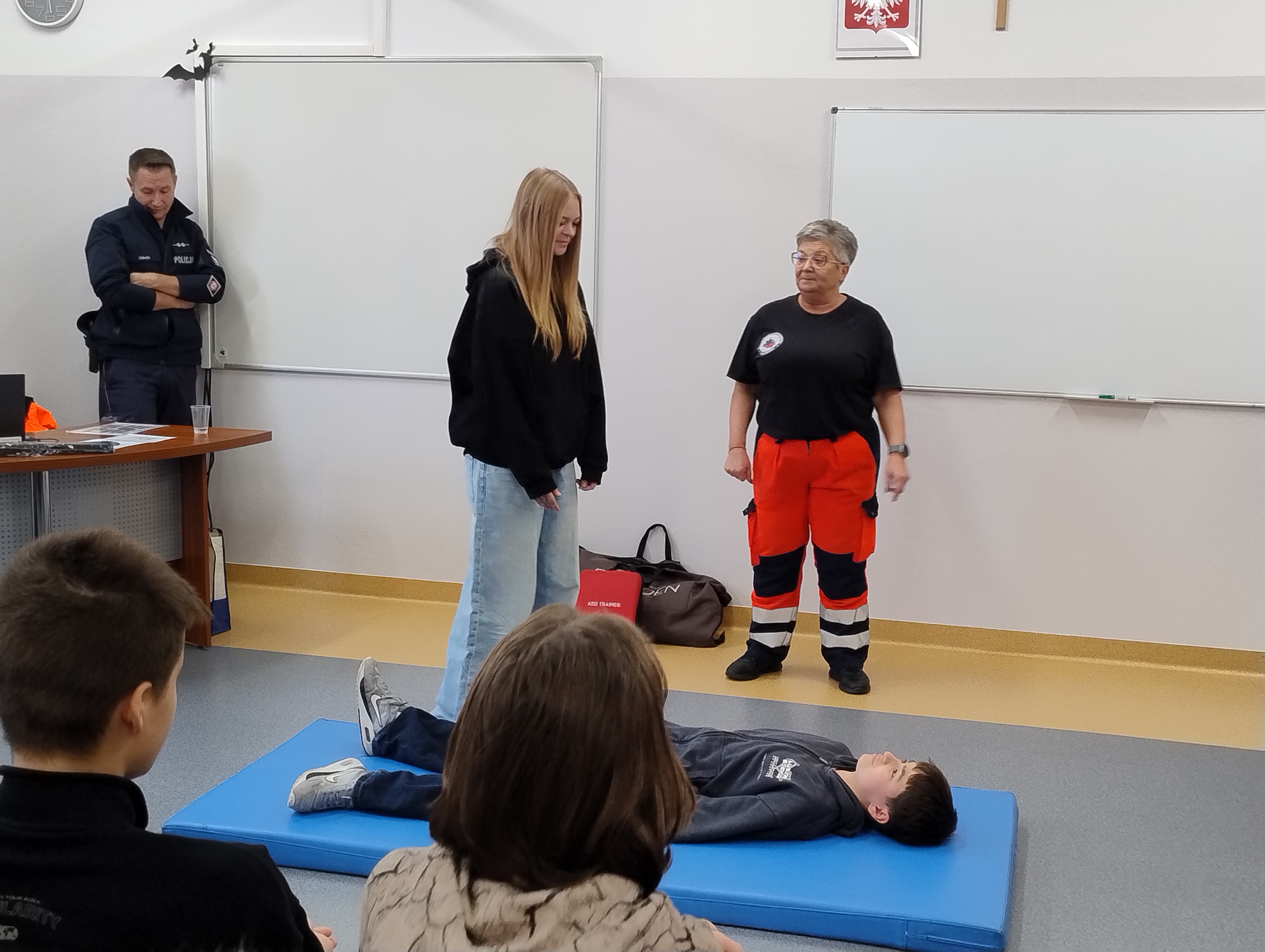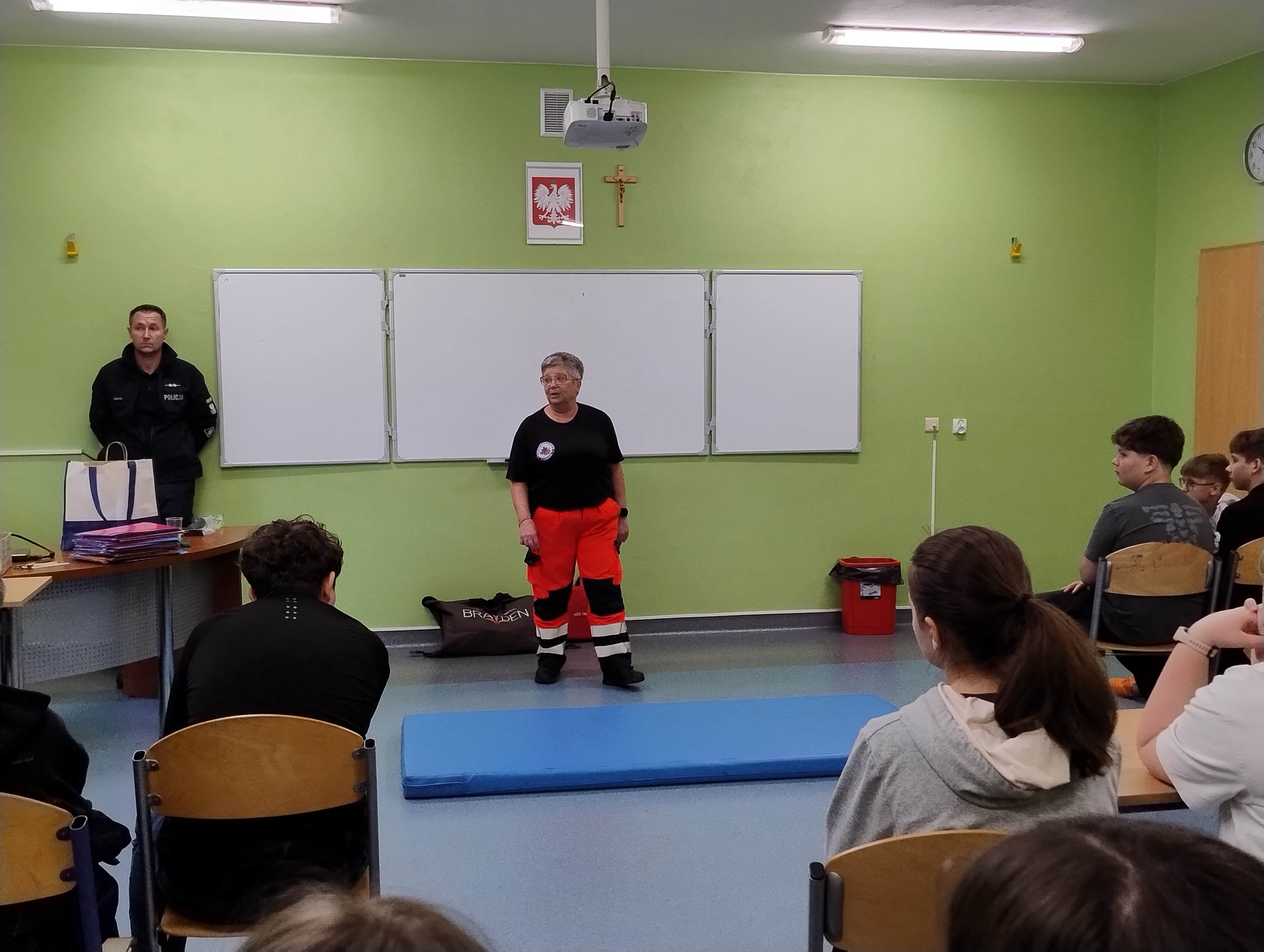 w Bełchatowie oraz ratownikiem medycznym ze Stowarzyszenia „Sztabu Ratownictwa”. Zajęcia poprowadziły p. Małgorzata Ratajczyk oraz p. Izabela Stasiak. Spotkanie z uczniami naszej szkoły miało charakter warsztatowy. Uczniowie uczyli się praktycznych umiejętności ratowania życia w nagłych wypadkach, obejmujących m.in. ocenę sytuacji, wezwanie pomocy, resuscytację krążeniowo-oddechową, jak również omówione zostały skutki uzależnienia od alkoholu, jego negatywny wpływ na organizm, w tym ryzyka zaburzeń rozwojowych u młodych ludzi. Na zakończenie zajęć, uczniowie otrzymali od asp. Marcina Agata opaski odblaskowe.