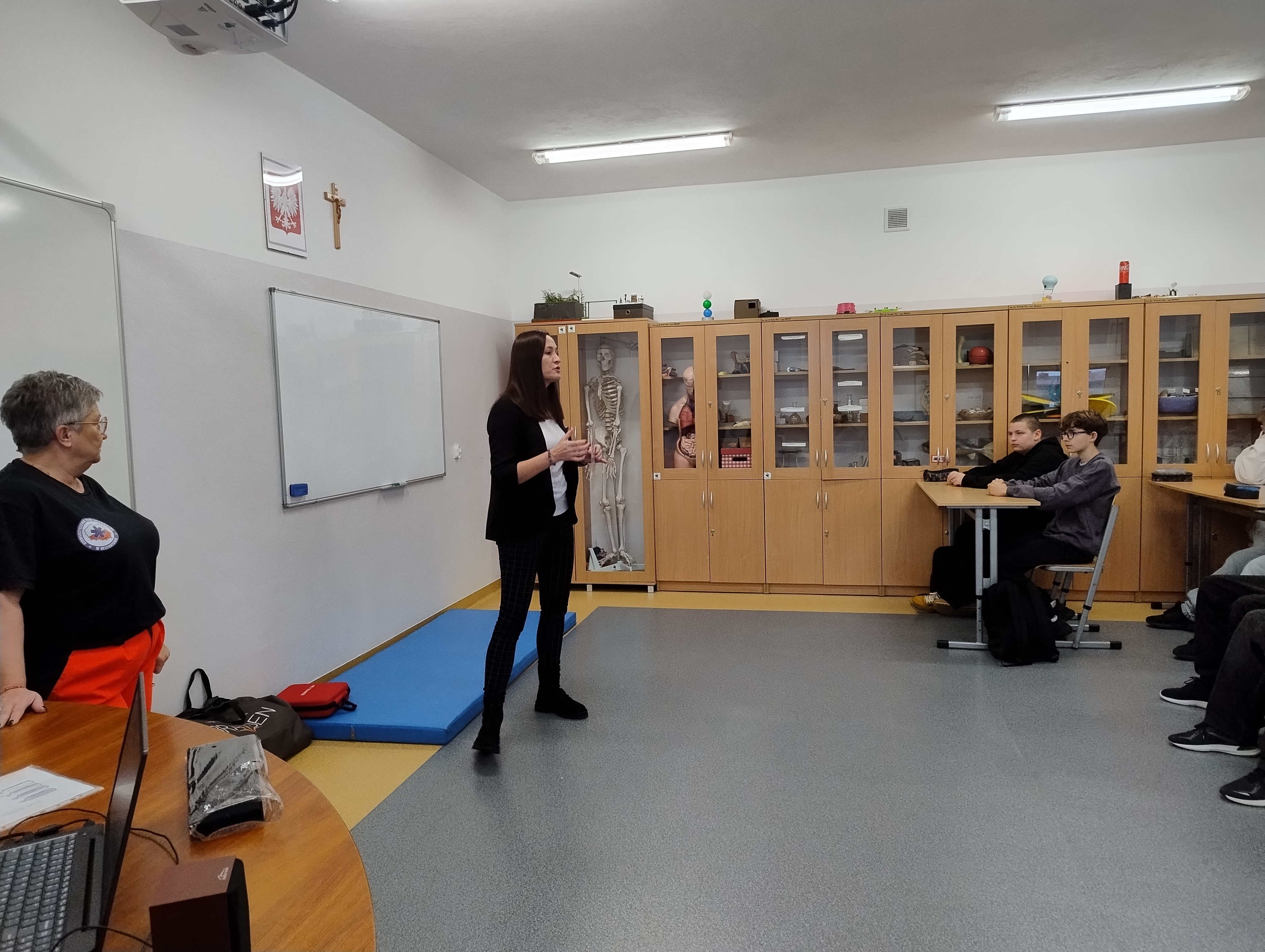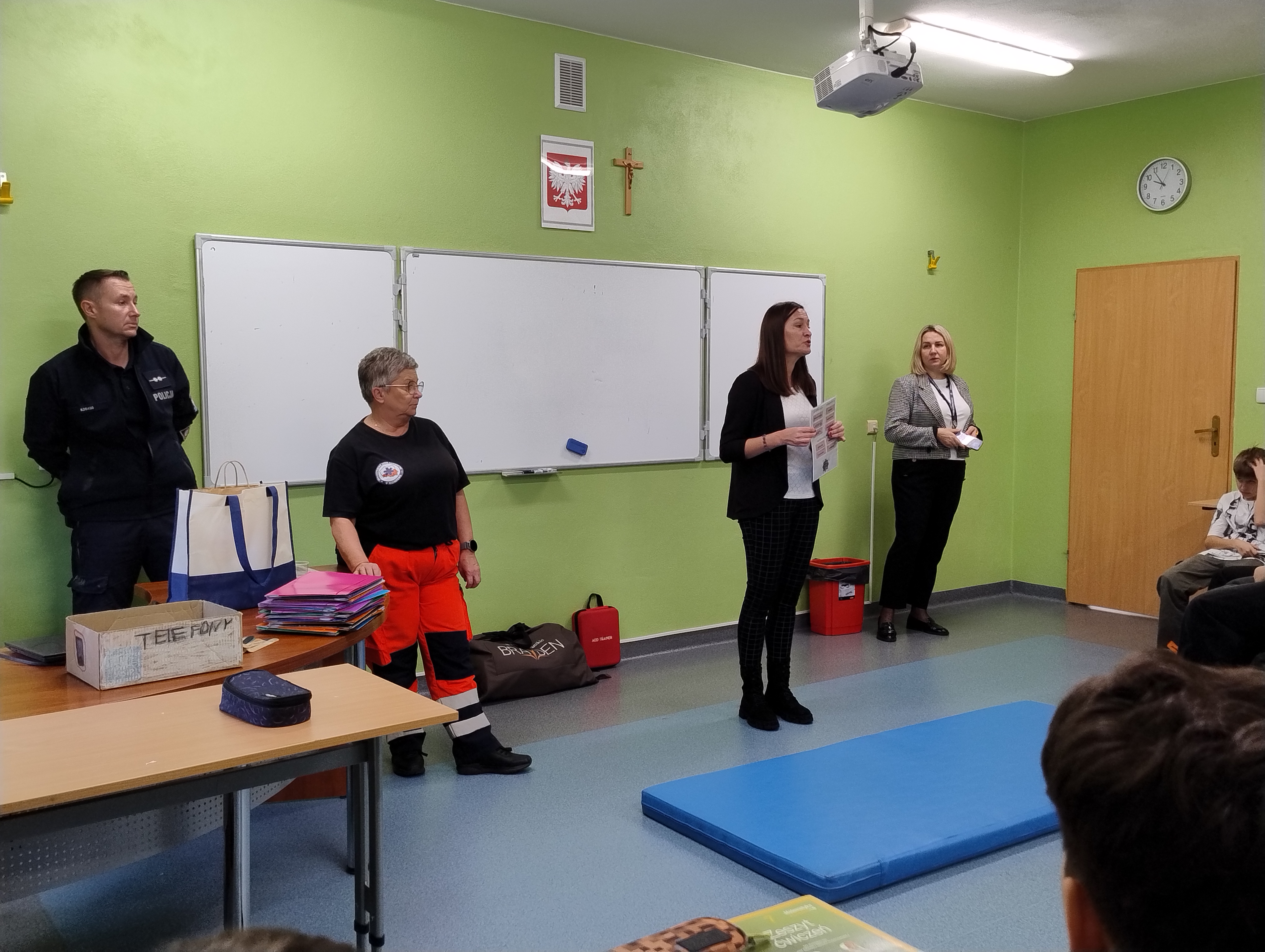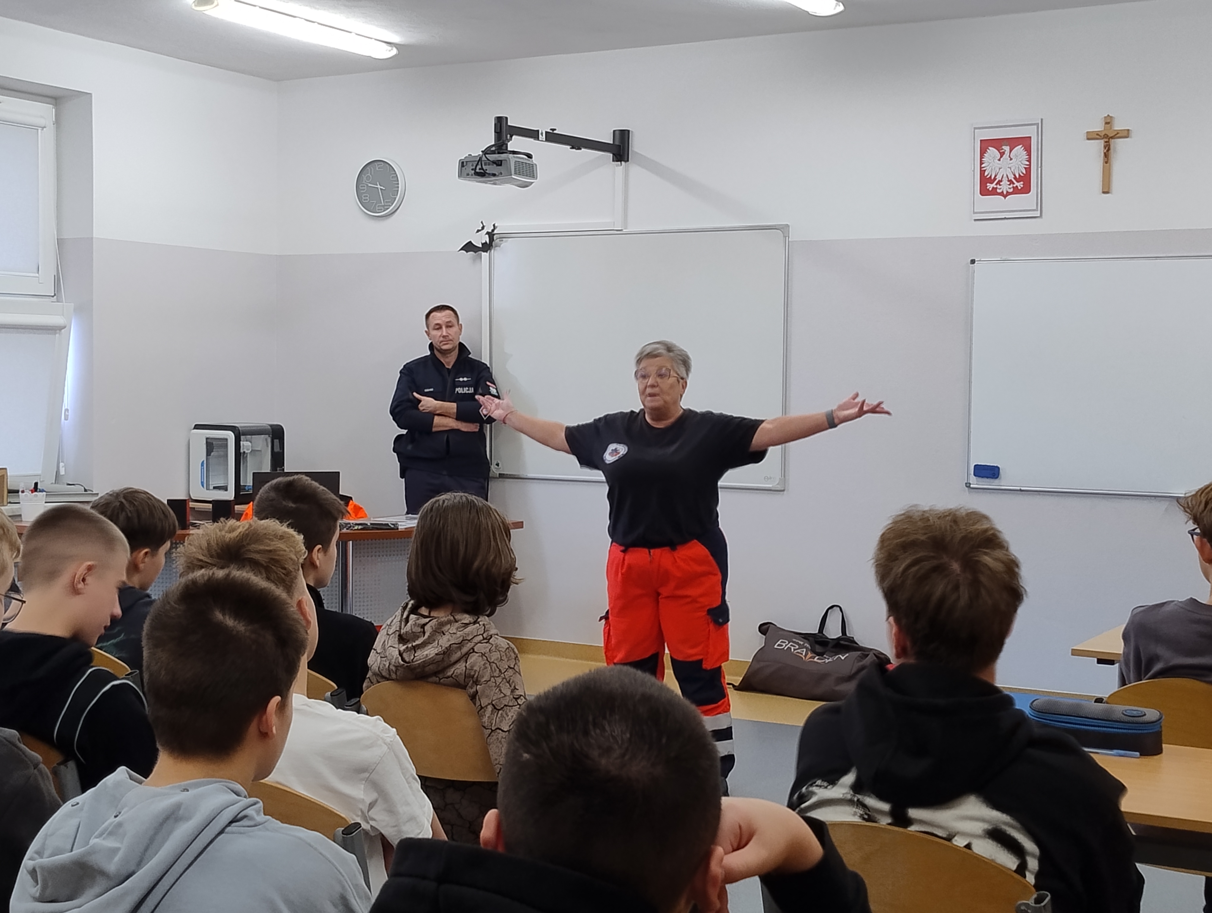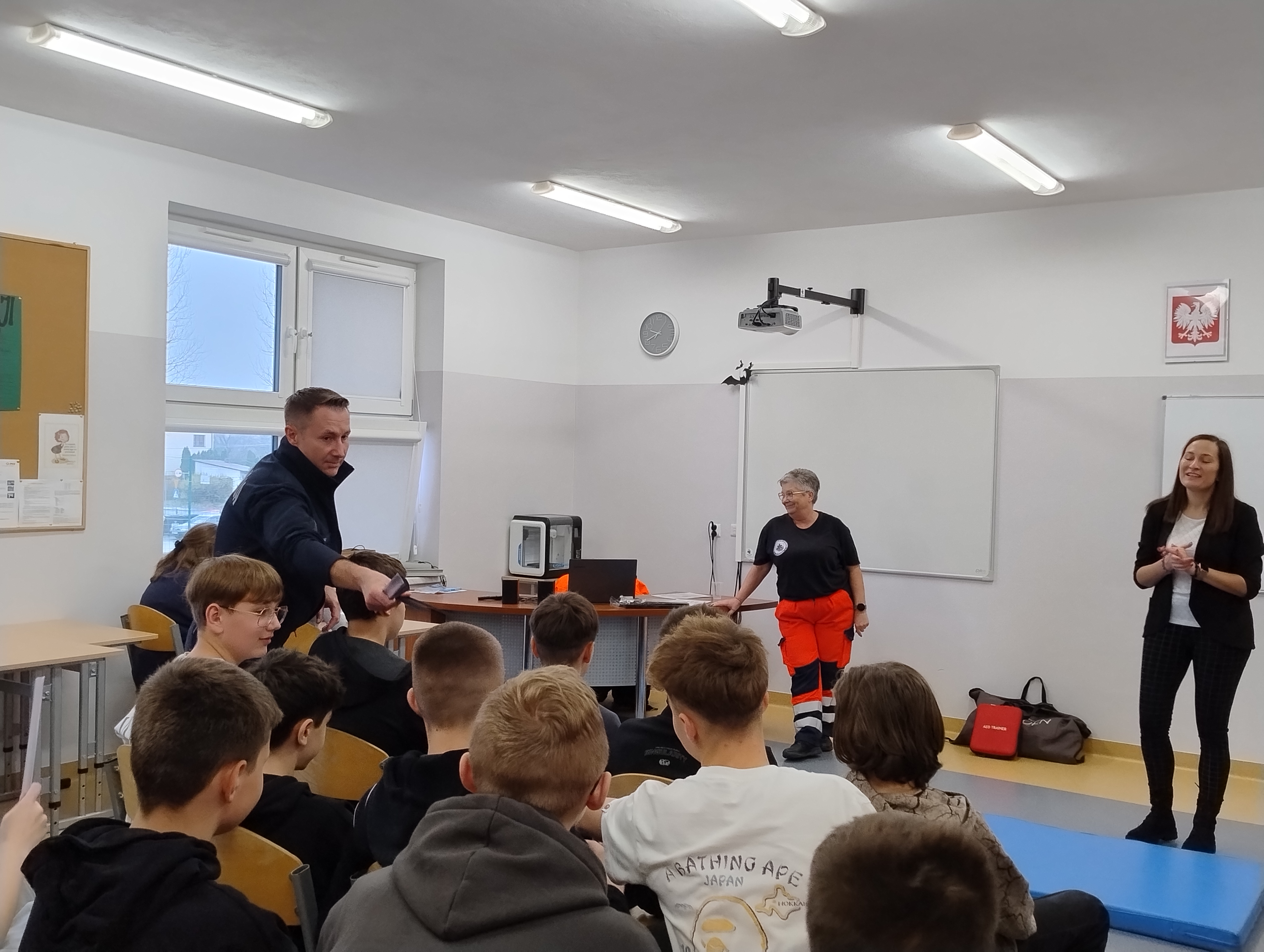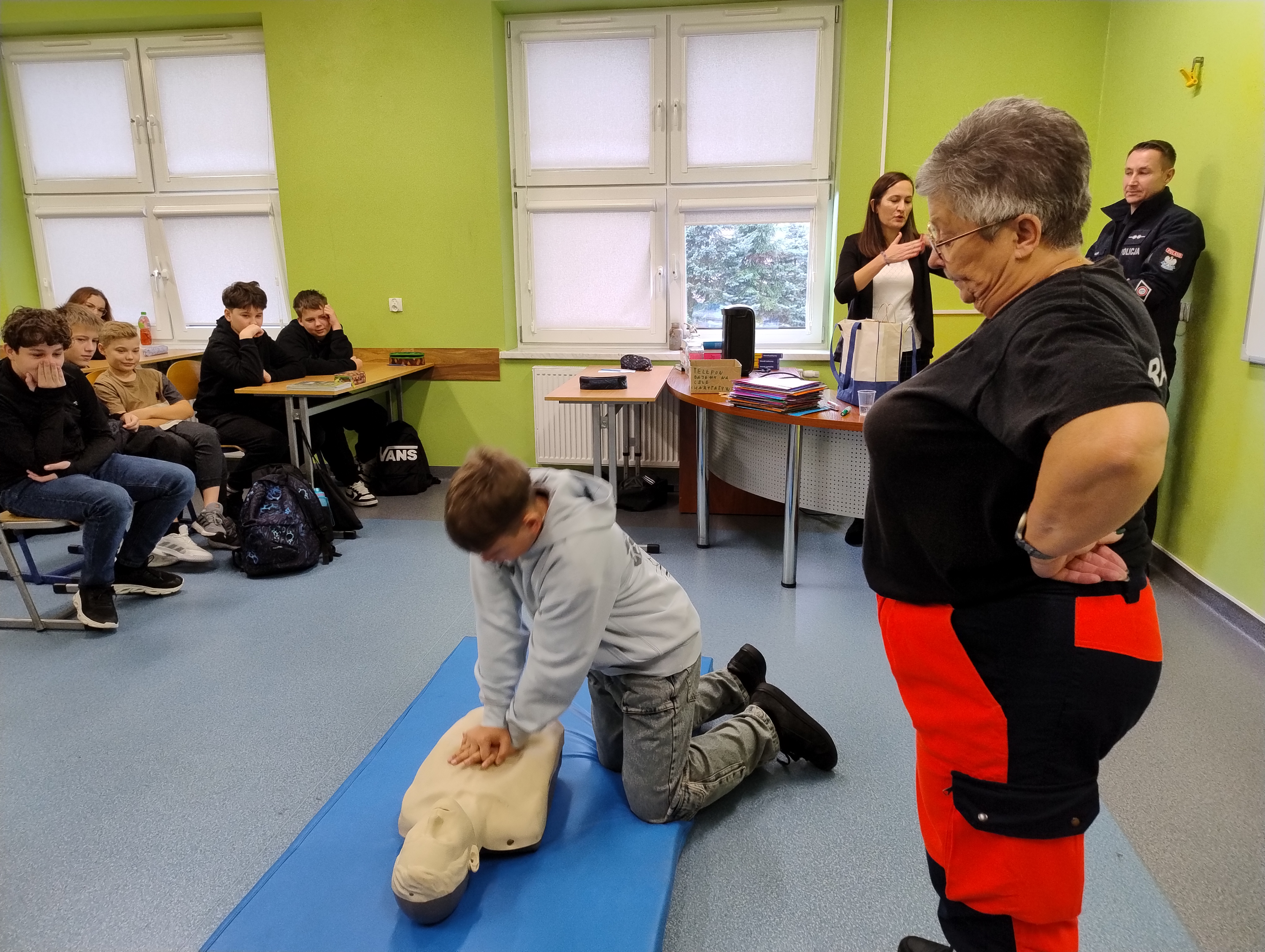 w Bełchatowie oraz ratownikiem medycznym ze Stowarzyszenia „Sztabu Ratownictwa”. Zajęcia poprowadziły p. Małgorzata Ratajczyk oraz p. Izabela Stasiak. Spotkanie z uczniami naszej szkoły miało charakter warsztatowy. Uczniowie uczyli się praktycznych umiejętności ratowania życia w nagłych wypadkach, obejmujących m.in. ocenę sytuacji, wezwanie pomocy, resuscytację krążeniowo-oddechową, jak również omówione zostały skutki uzależnienia od alkoholu, jego negatywny wpływ na organizm, w tym ryzyka zaburzeń rozwojowych u młodych ludzi. Na zakończenie zajęć, uczniowie otrzymali od asp. Marcina Agata opaski odblaskowe.
