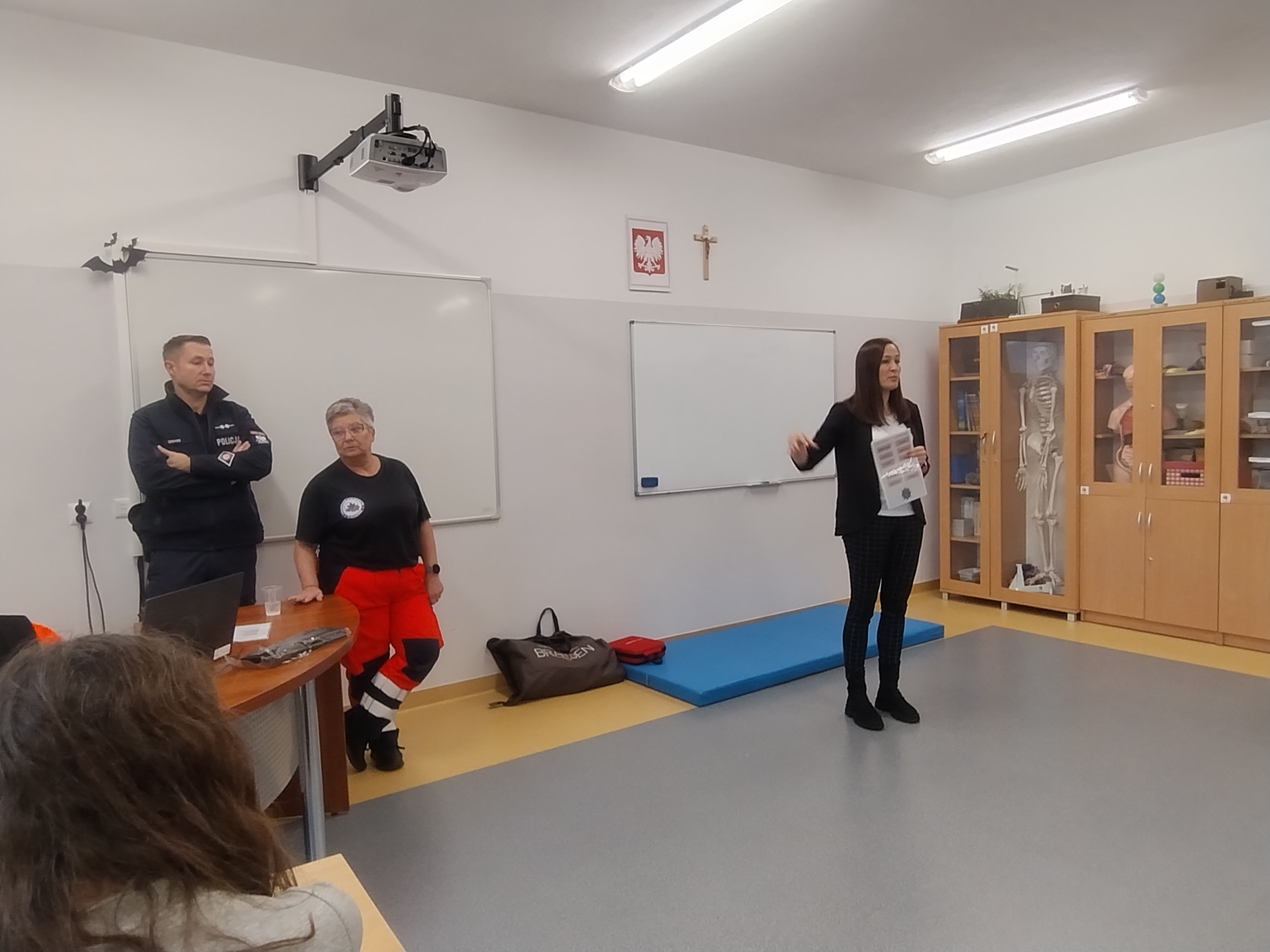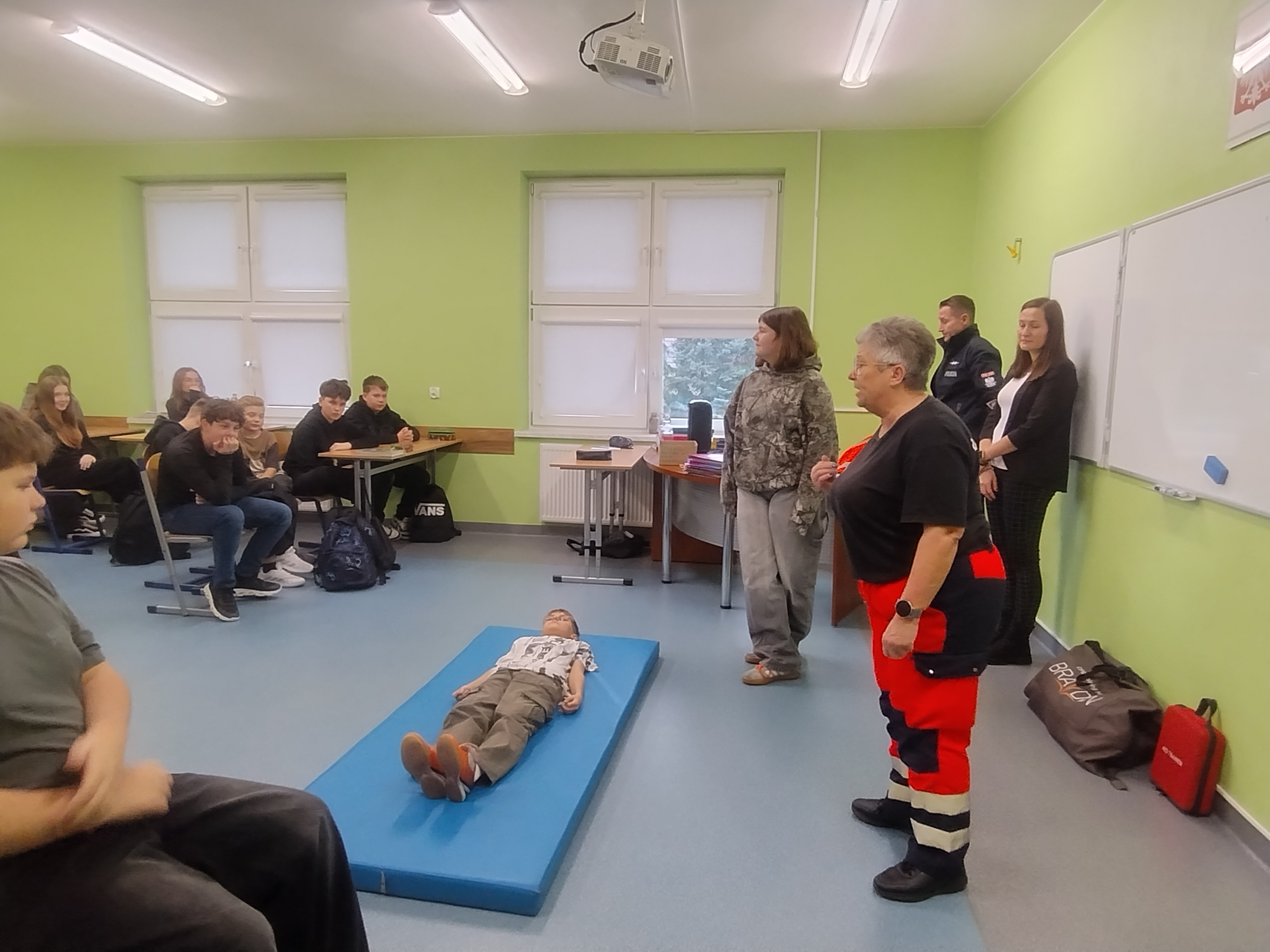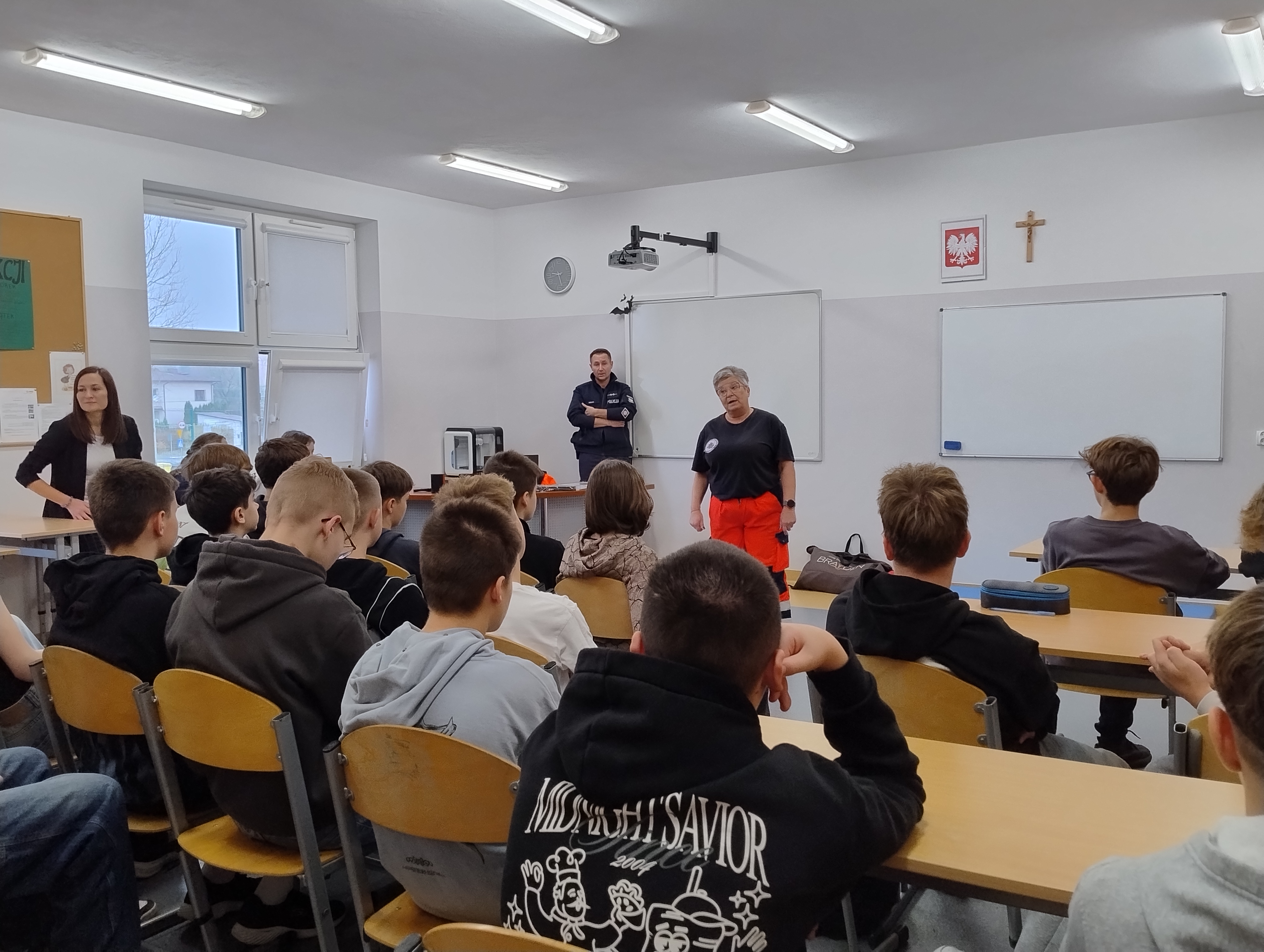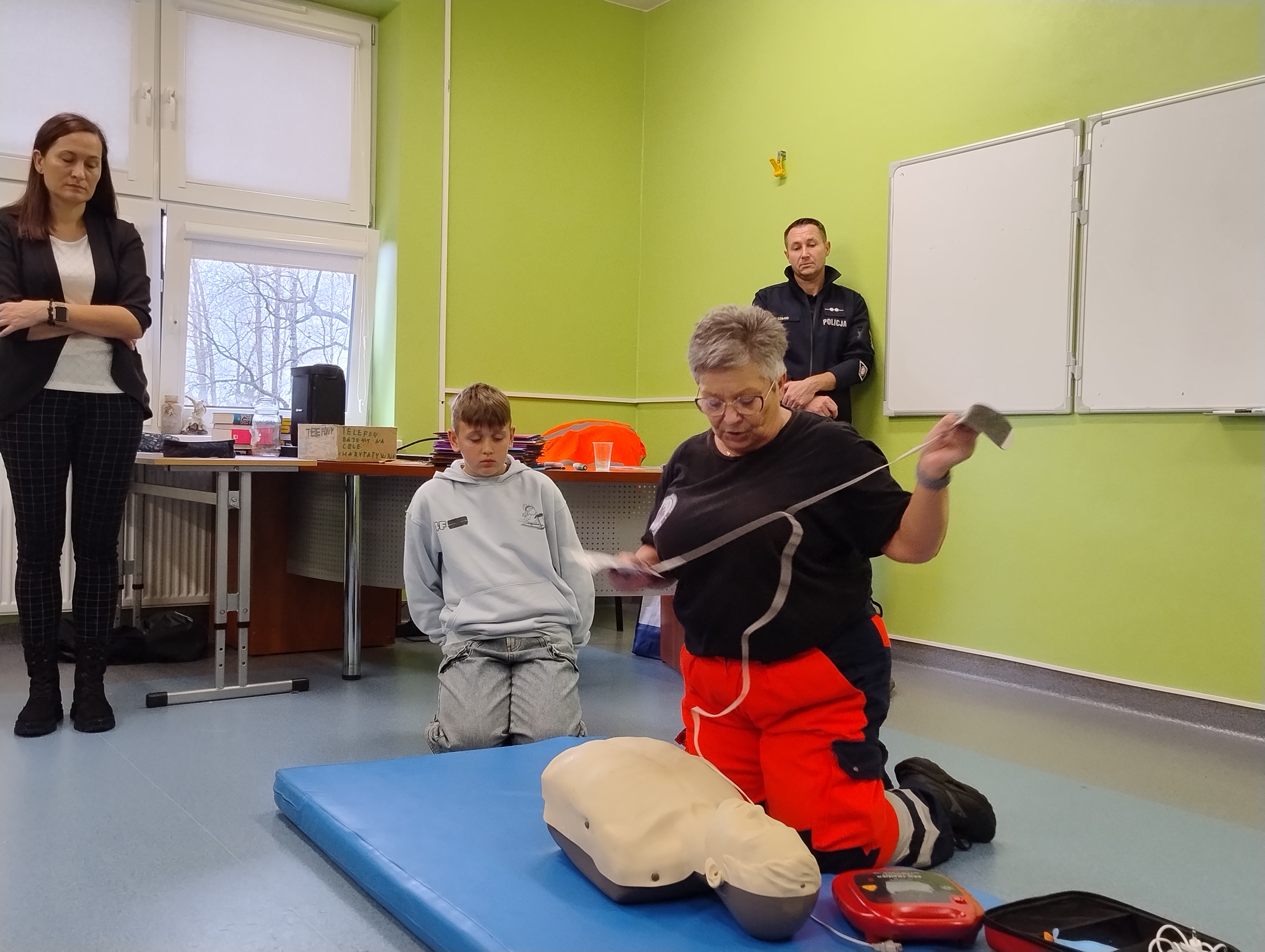 w Bełchatowie oraz ratownikiem medycznym ze Stowarzyszenia „Sztabu Ratownictwa”. Zajęcia poprowadziły p. Małgorzata Ratajczyk oraz p. Izabela Stasiak. Spotkanie z uczniami naszej szkoły miało charakter warsztatowy. Uczniowie uczyli się praktycznych umiejętności ratowania życia w nagłych wypadkach, obejmujących m.in. ocenę sytuacji, wezwanie pomocy, resuscytację krążeniowo-oddechową, jak również omówione zostały skutki uzależnienia od alkoholu, jego negatywny wpływ na organizm, w tym ryzyka zaburzeń rozwojowych u młodych ludzi. Na zakończenie zajęć, uczniowie otrzymali od asp. Marcina Agata opaski odblaskowe.