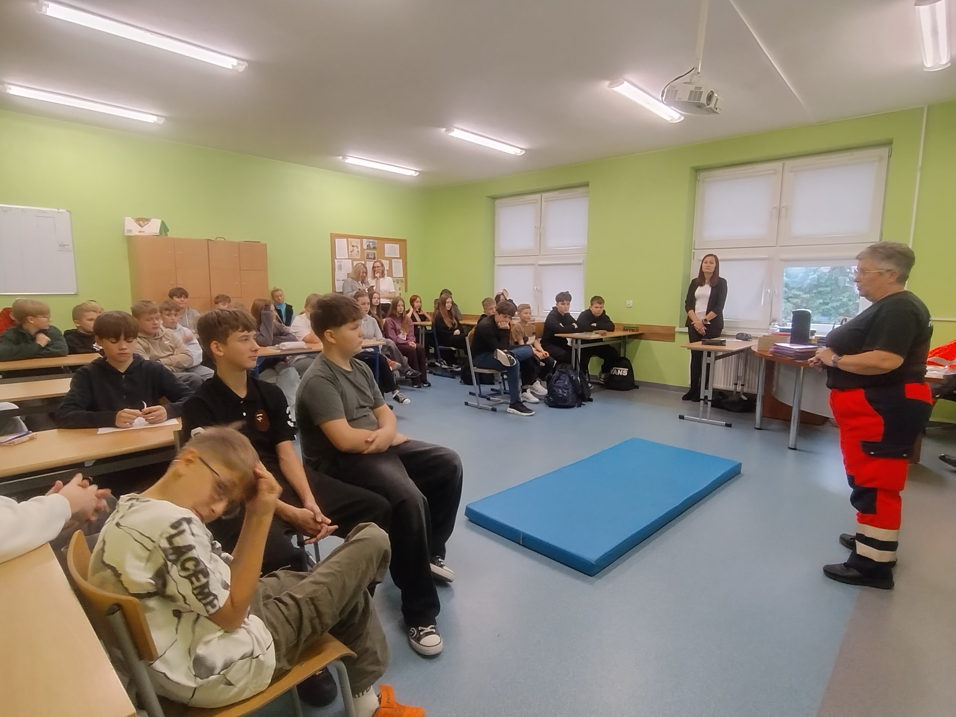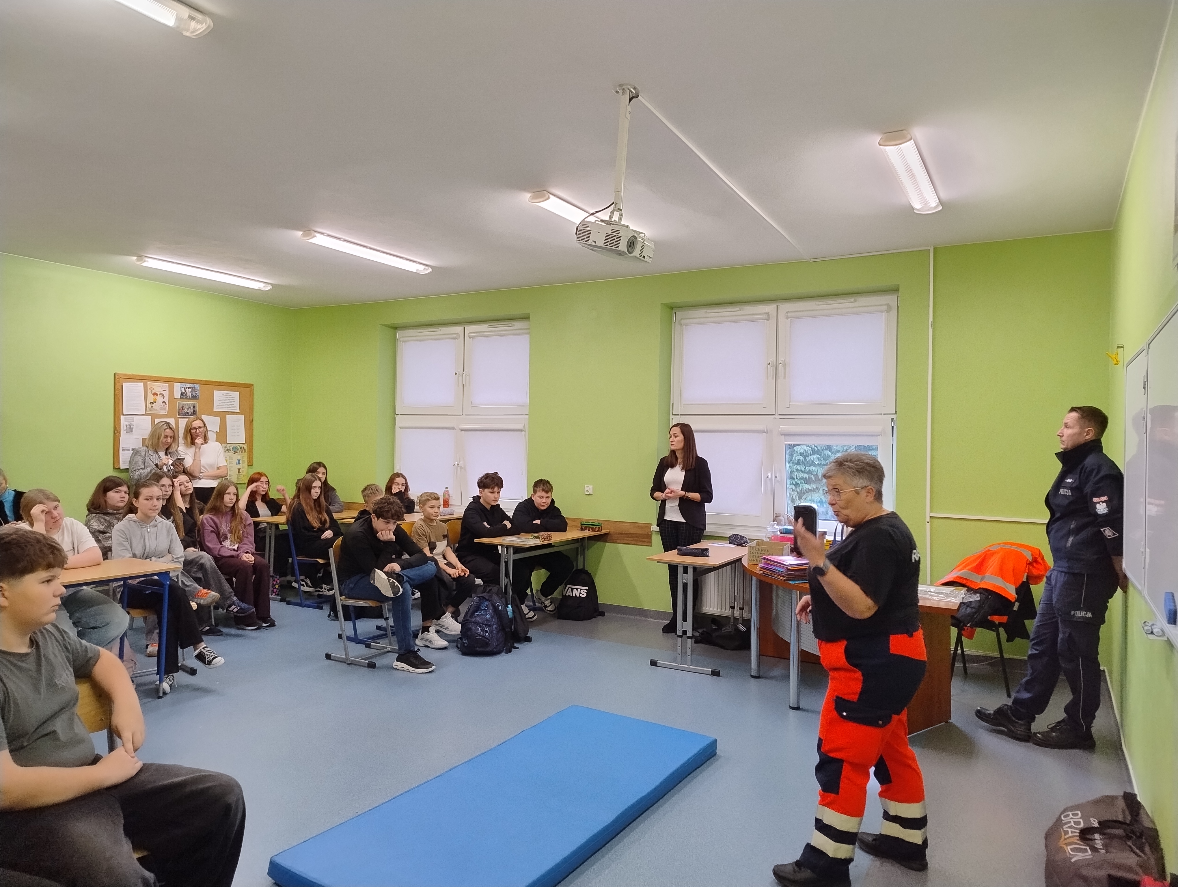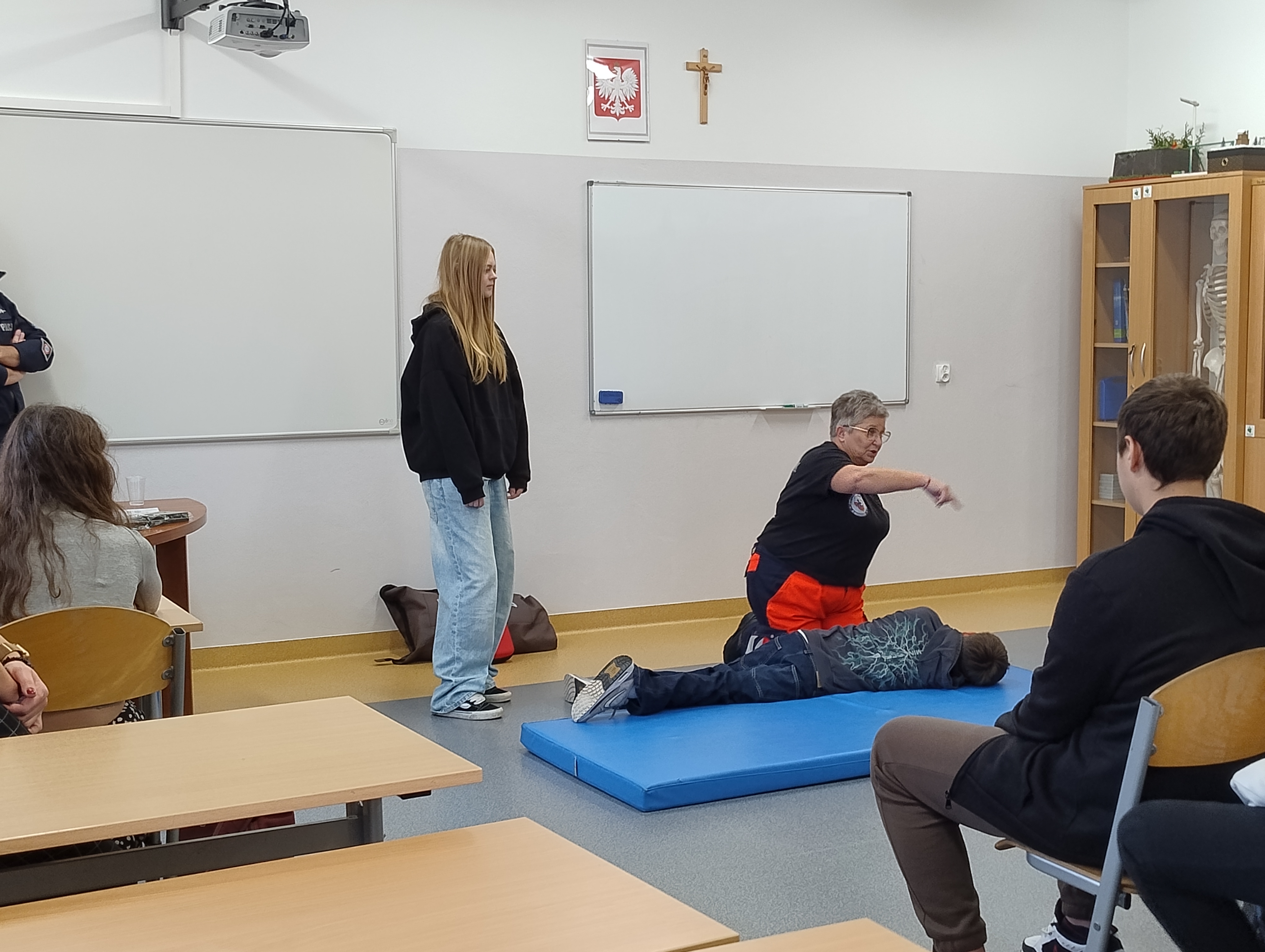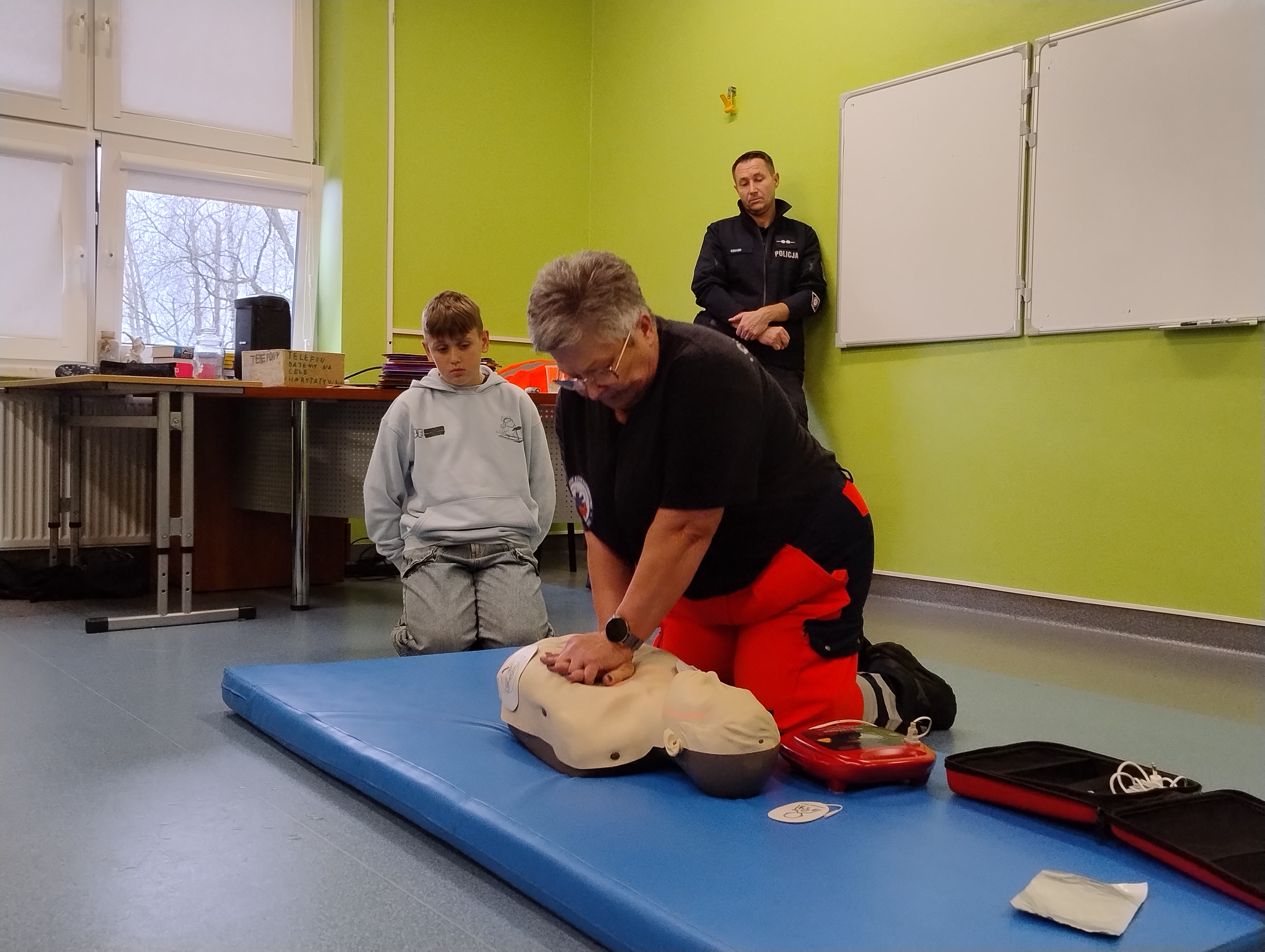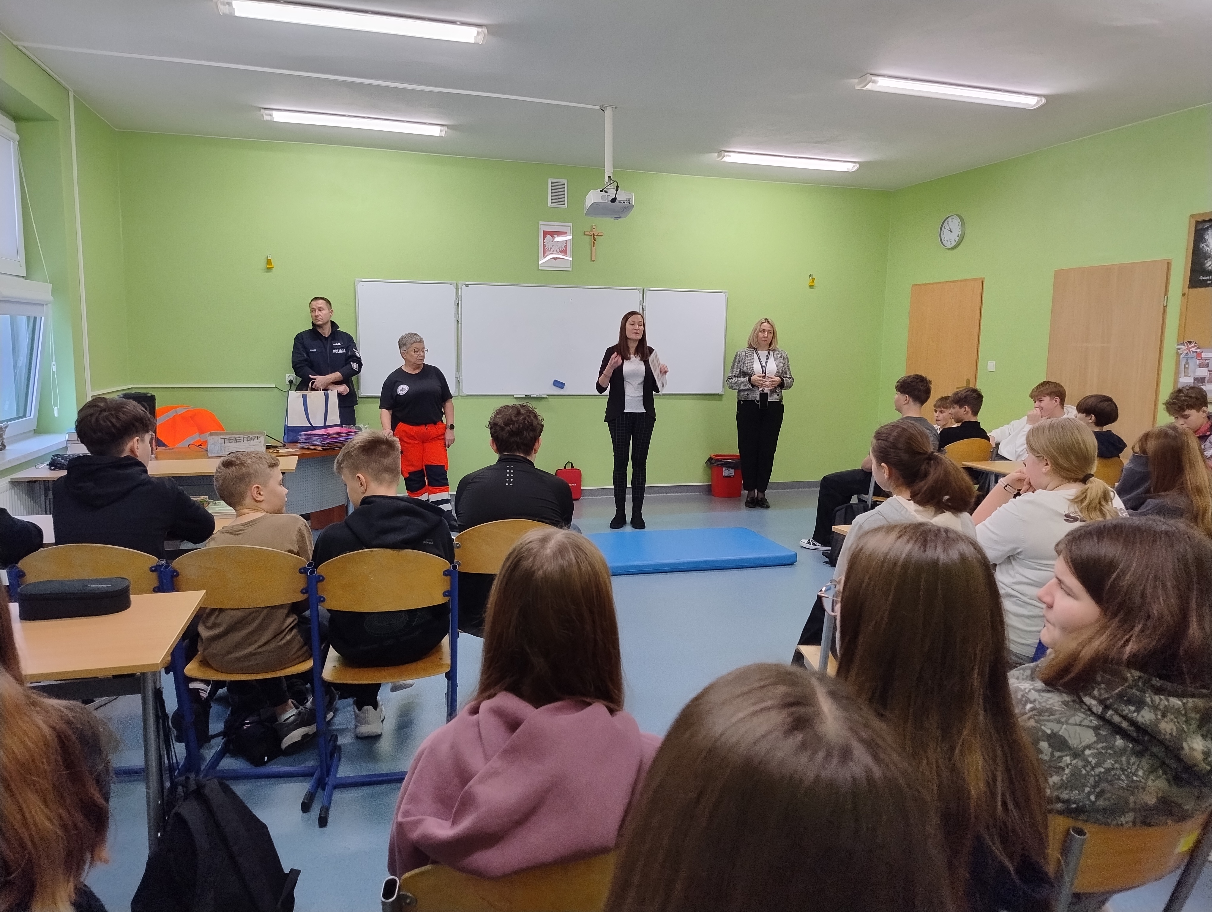 w Bełchatowie oraz ratownikiem medycznym ze Stowarzyszenia „Sztabu Ratownictwa”. Zajęcia poprowadziły p. Małgorzata Ratajczyk oraz p. Izabela Stasiak. Spotkanie z uczniami naszej szkoły miało charakter warsztatowy. Uczniowie uczyli się praktycznych umiejętności ratowania życia w nagłych wypadkach, obejmujących m.in. ocenę sytuacji, wezwanie pomocy, resuscytację krążeniowo-oddechową, jak również omówione zostały skutki uzależnienia od alkoholu, jego negatywny wpływ na organizm, w tym ryzyka zaburzeń rozwojowych u młodych ludzi. Na zakończenie zajęć, uczniowie otrzymali od asp. Marcina Agata opaski odblaskowe.