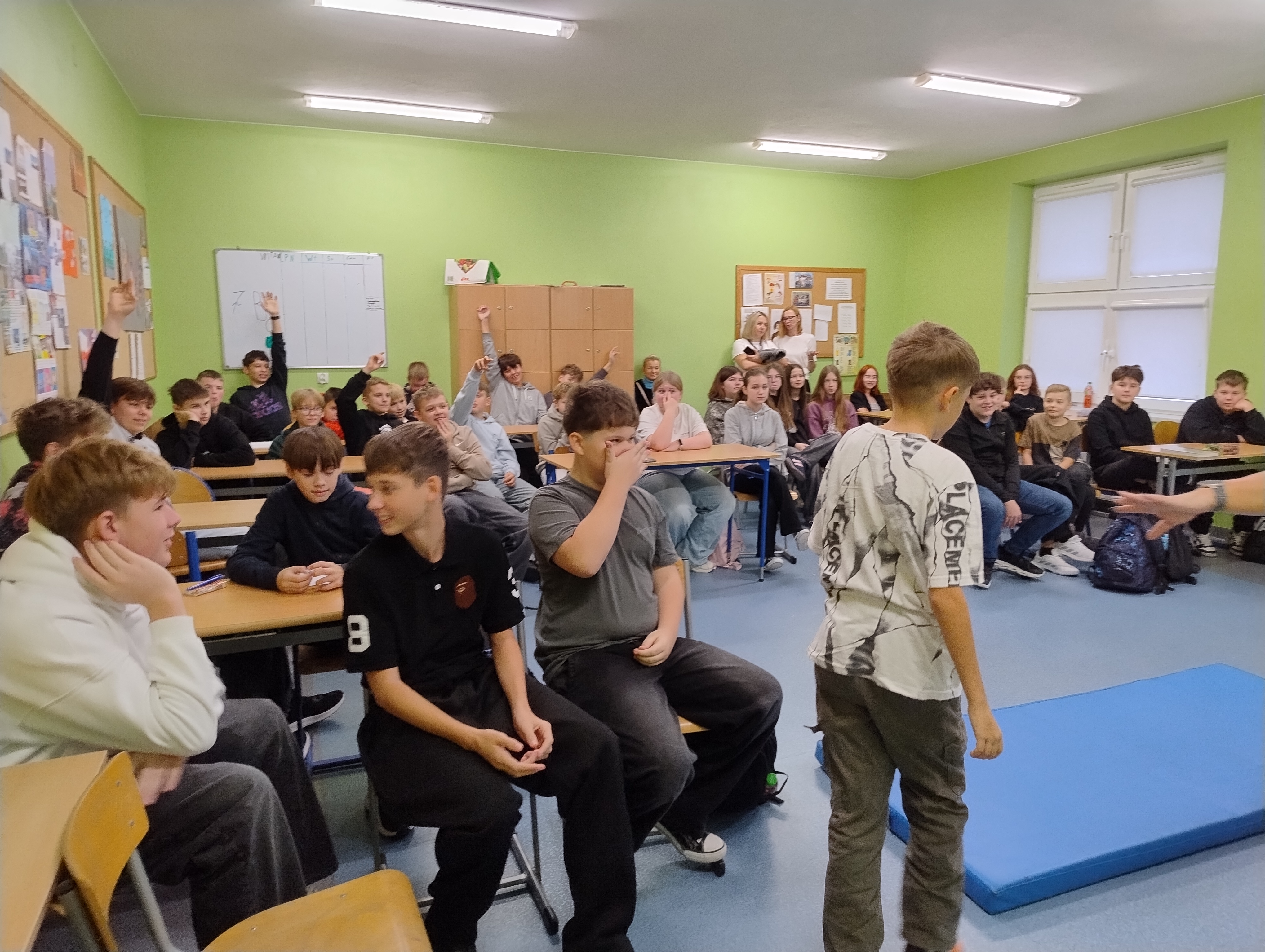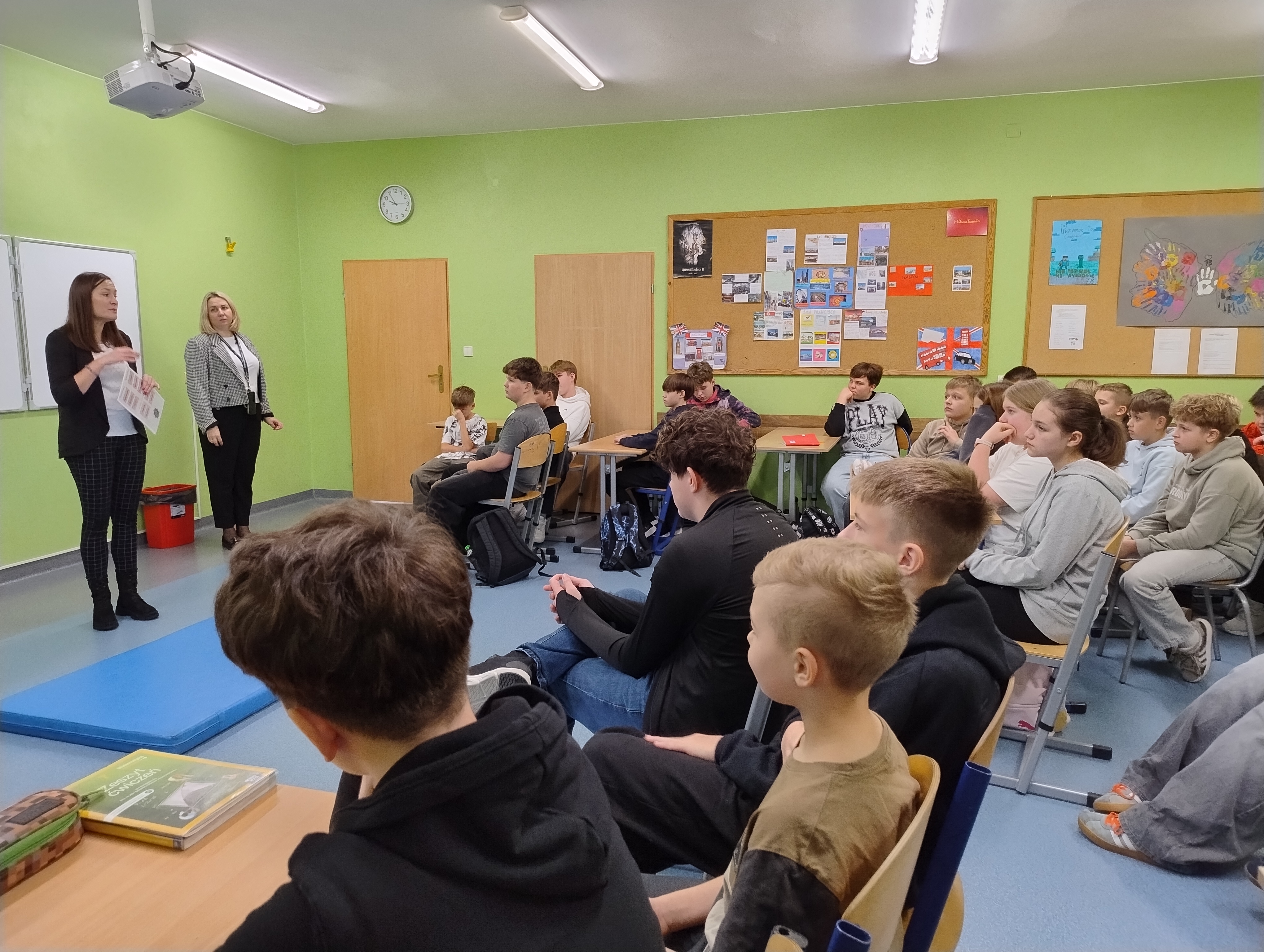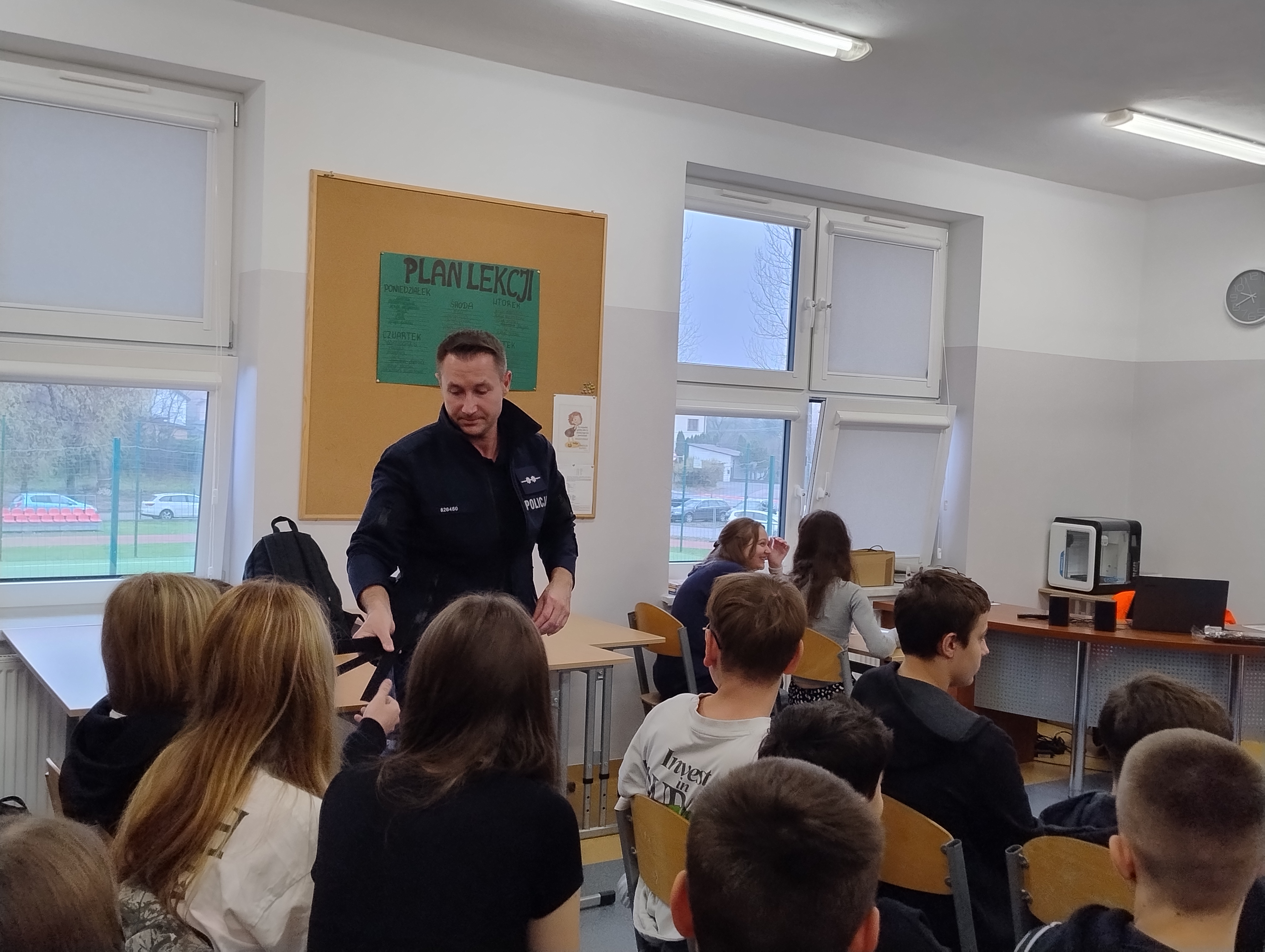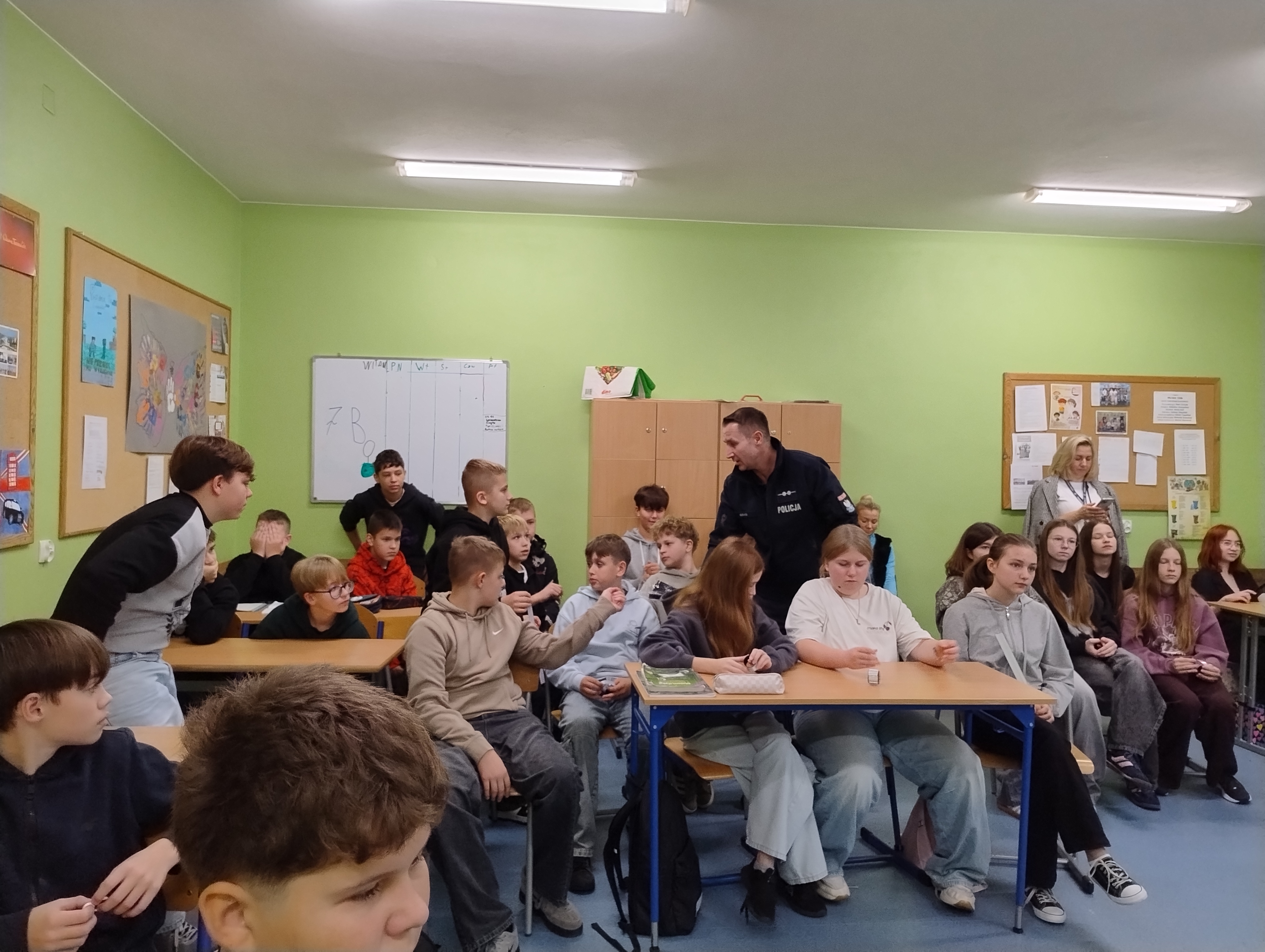 W dniu 12 listopada 2025 uczniowie klas 7 i 8 uczestniczyli w spotkaniu z pracownikami Zespołu ds. Profilaktyki Społecznej i Patologii Wydziału Prewencji Komendy Powiatowej