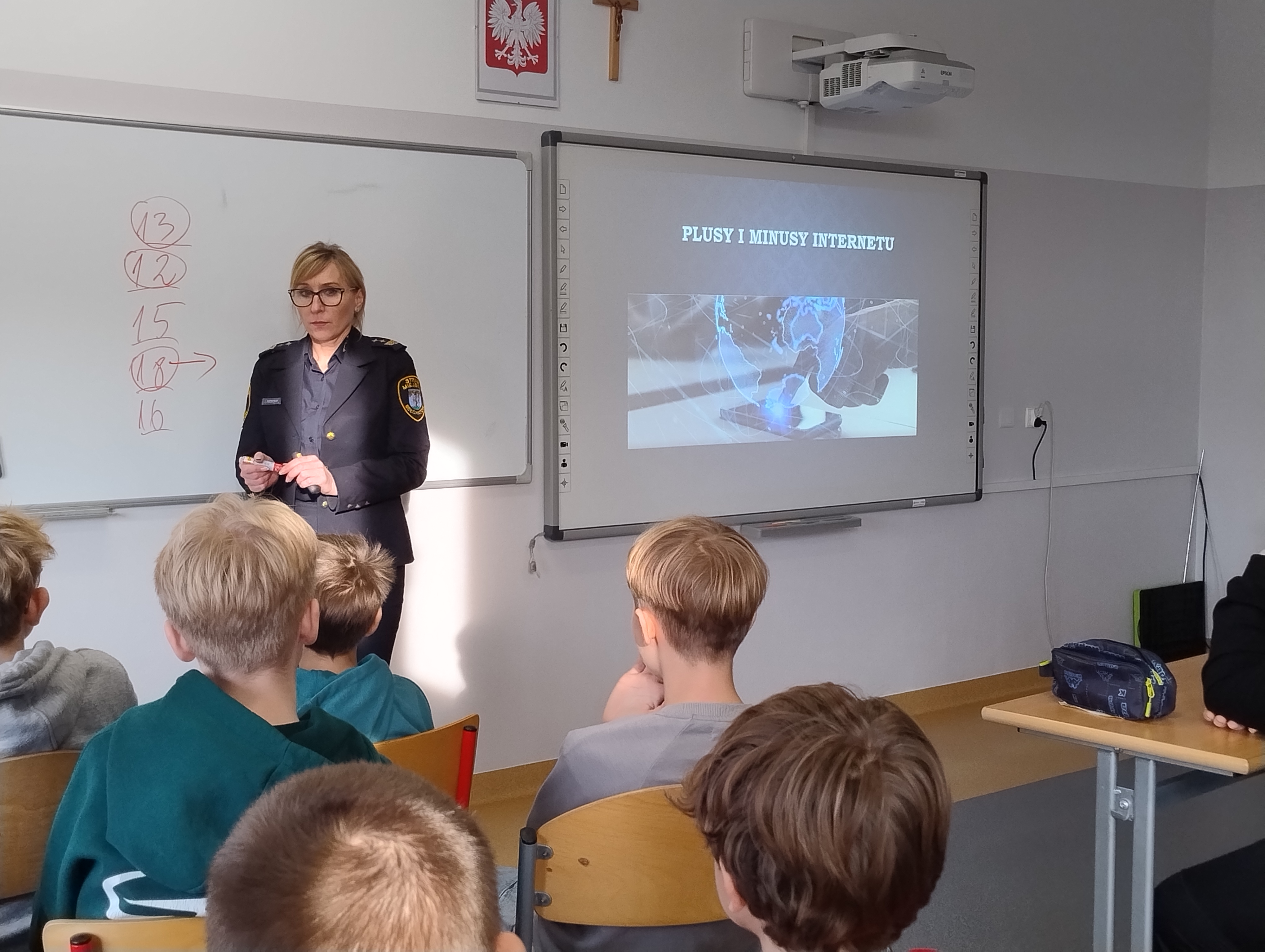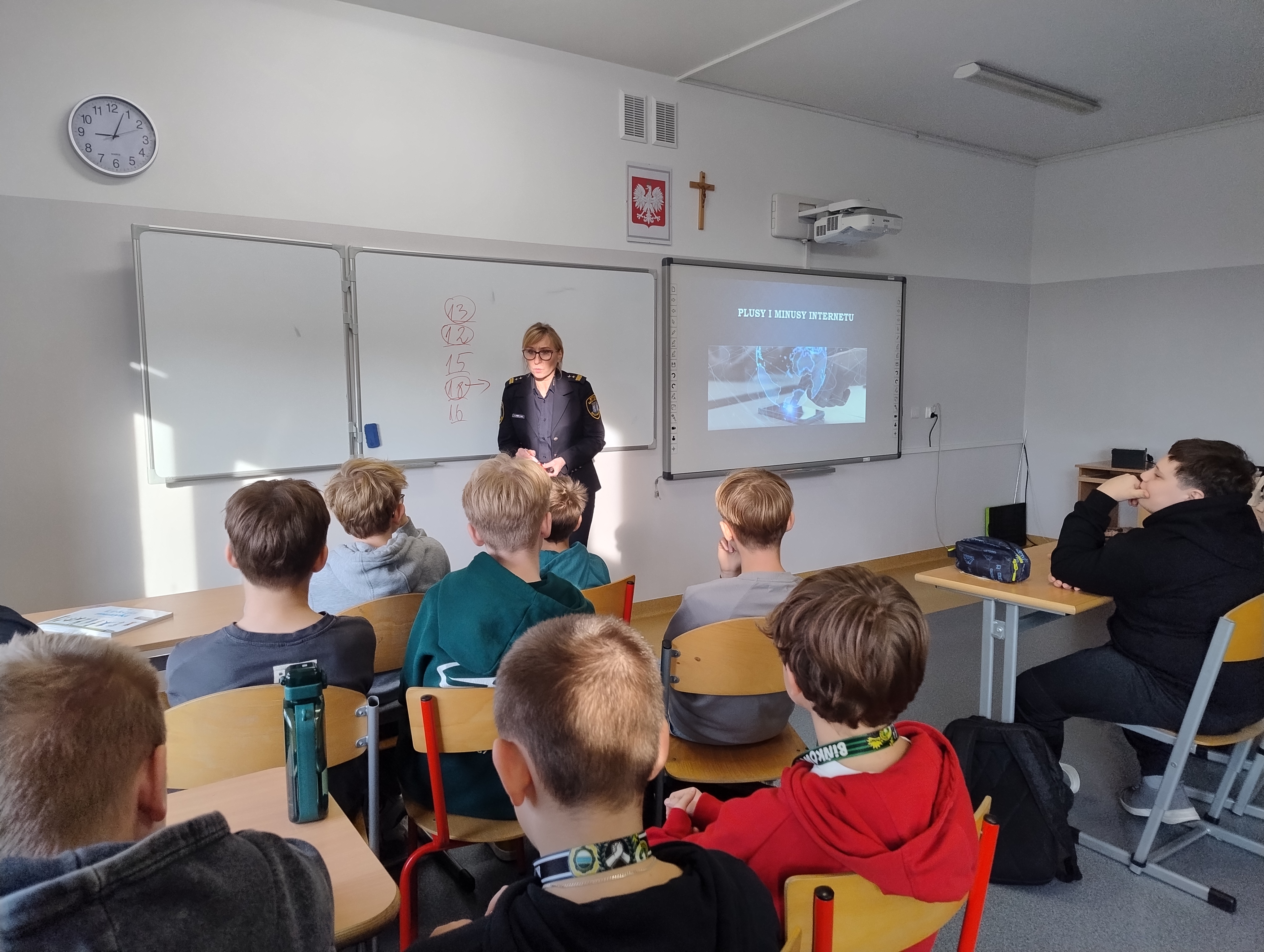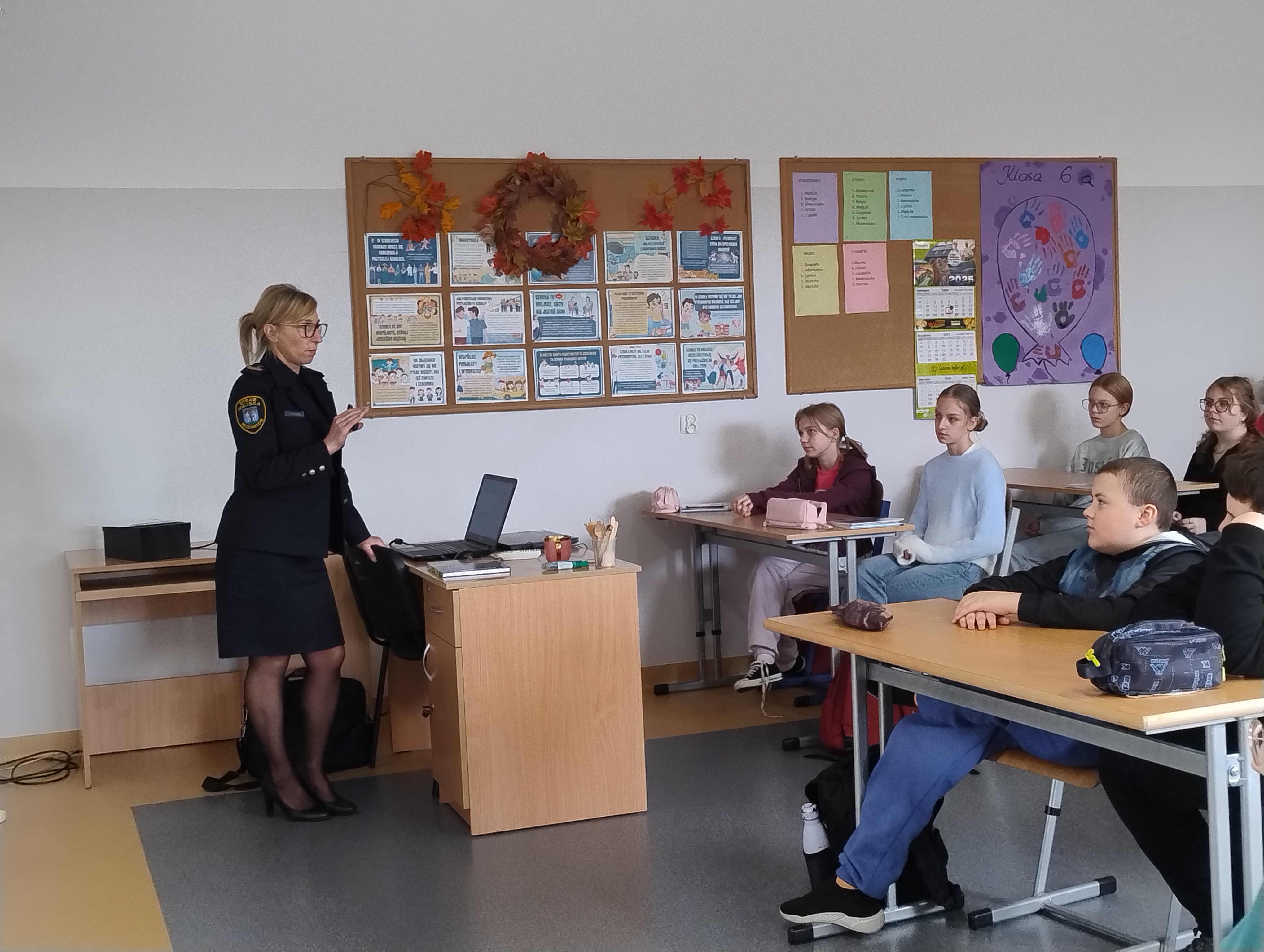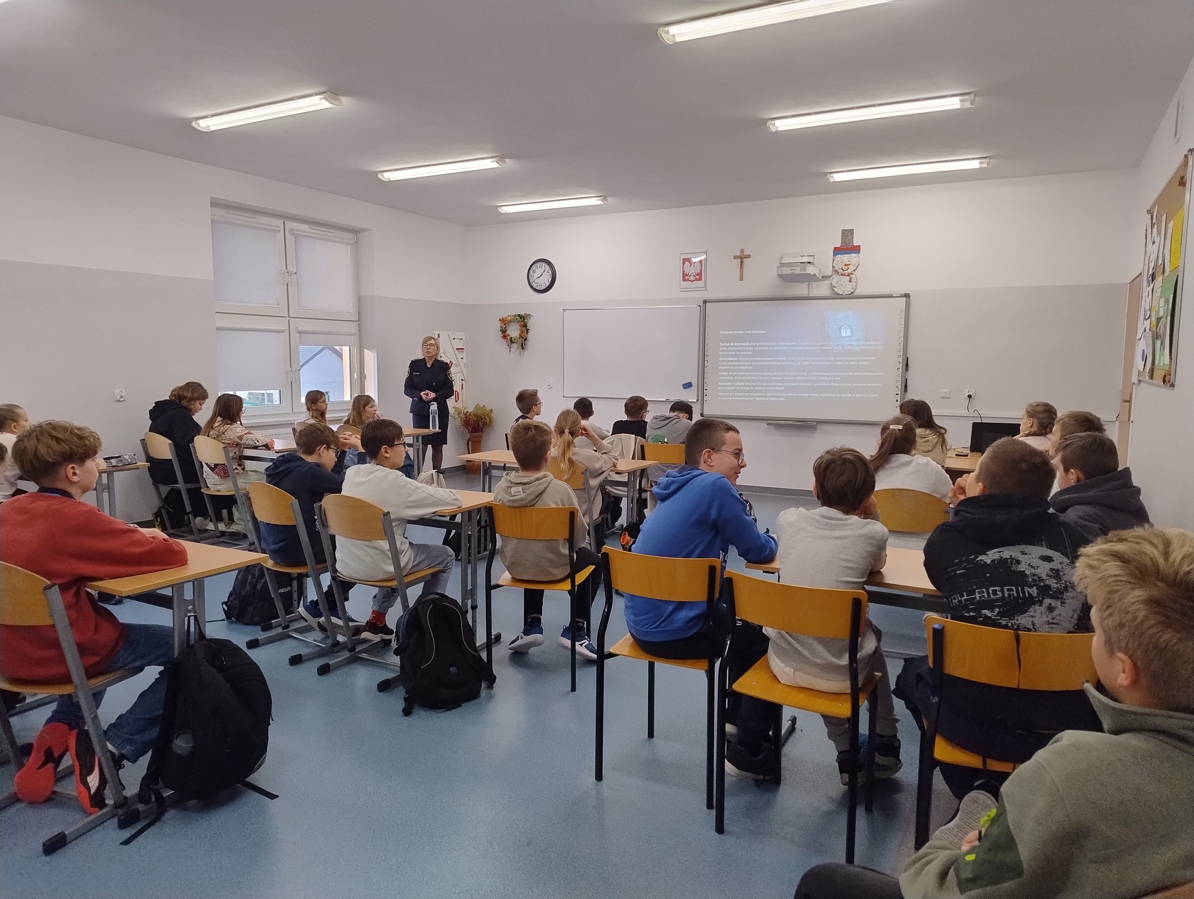 W dniu 20.11.2025 r. uczniowie klas 5 i 6 uczestniczyli w zajęciach z inspektorem, p. Jagodą Nieborak, Koordynatorem Zespołu ds. nieletnich i profilaktyki szkolnej.