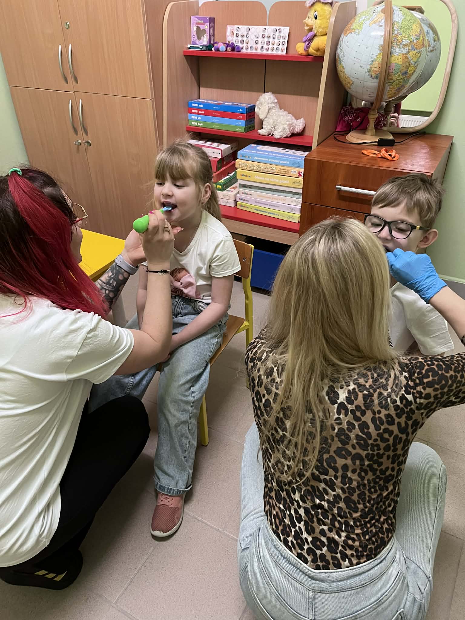Podczas otwartej lekcji logopedycznej wspólnie pracowaliśmy nad stabilizacją żuchwy, izolacją ruchów żuchwy od ruchów języka, wywoływaliśmy głoski ciszące u Radka i głoskę R u Antosi. W tym celu m.in. wykonywaliśmy ćwiczenia języka z użyciem tubek żuchwowych, pracowaliśmy z wibratorem logopedycznym „Rerkiem”, wykonywaliśmy ćwiczenia na wzmocnienie tylnej części języka.
