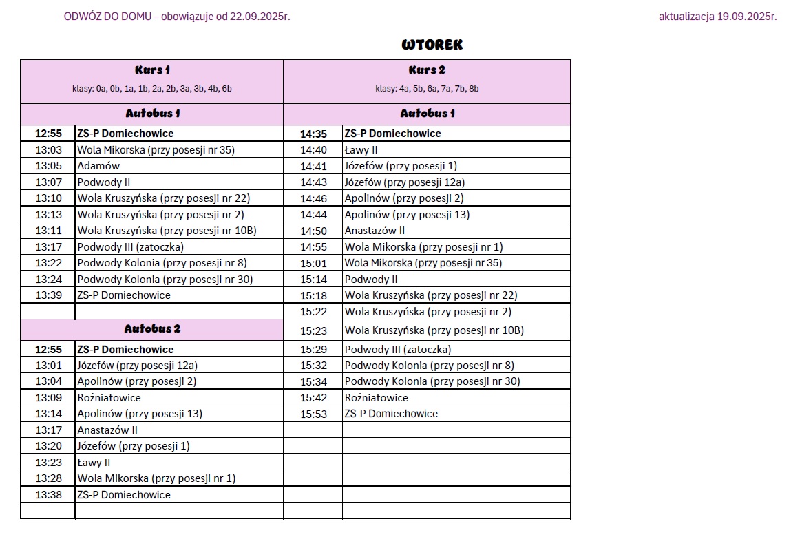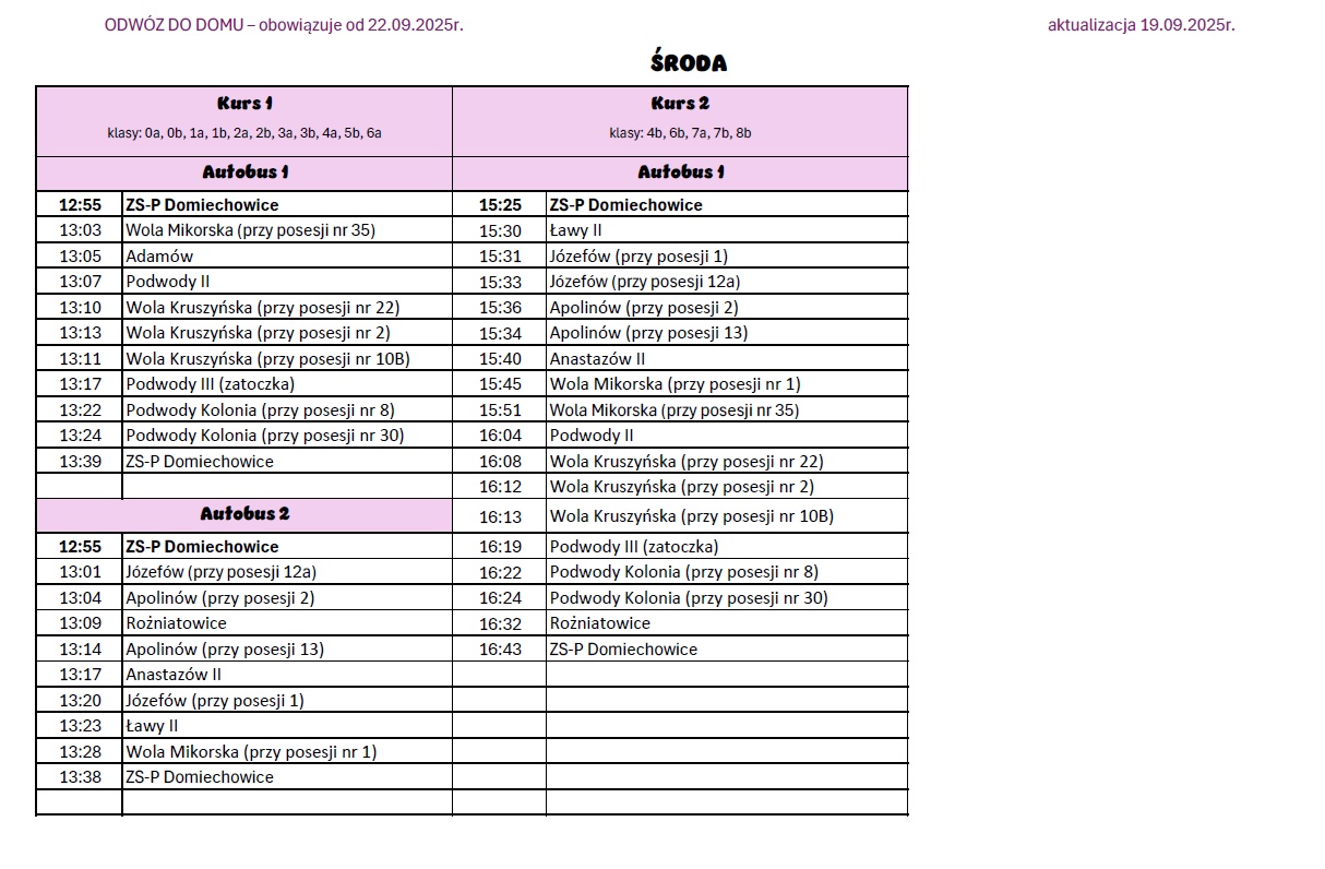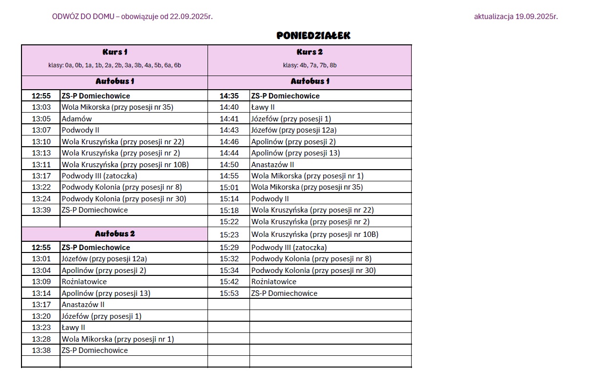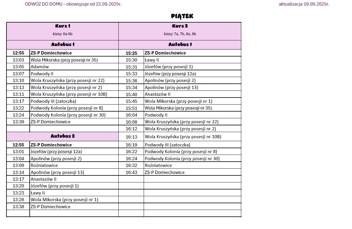 Informujemy, iż od 22.09.2025r. zmianie ulegają godziny odwozu do domu. Po szóstej godzinie lekcyjnej przerwy zostały skrócone na 5-cio minutowe, więc autobus będzie odjeżdżał 5 minut wcześniej. Odjazdy które uległy zmianie: godzina 14:40 na 14:35 i 15:35 na 15:25. Pozostałe godziny są bez zmian.